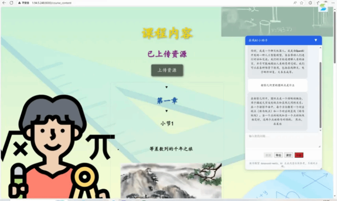 “数韵文心实践队”文化艺术服务团聚焦数学文化课程资源开发,跨学科整合数学、计算机与外语专业学生,基于500余份问卷分析高考文化命题趋势,开发8集微课,将方程智慧与古建筑几何密码融入教学;自主研发“数学文化课程管理系统”,集成AI导学与文化图谱,实现资源模块化与智能问答,以代码为笔、数理为墨,真正让严谨的数理光芒与鲜活的人文温度同频共振。