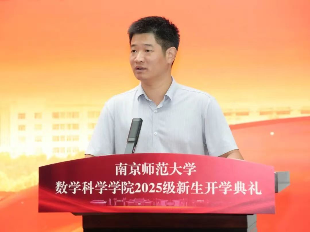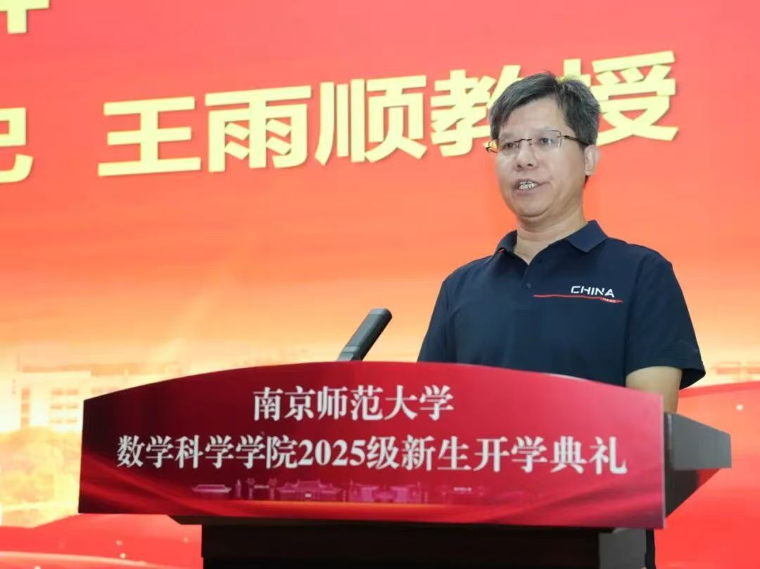在庄严的国歌声中,开学典礼正式拉开帷幕。院党委书记王雨顺首先致辞,他代表学院向全体2025级新生表示热烈的欢迎和最诚挚的祝贺,并与新生们简要介绍了与校训“正德厚生,笃学敏行”一脉相承的“严谨求实,创新进取”的学院风貌,希望同学们永怀感恩之心,不断攀登数学高峰,塑造健全人格,胸怀家国天下,为未来的人生做好规划,打好基础。