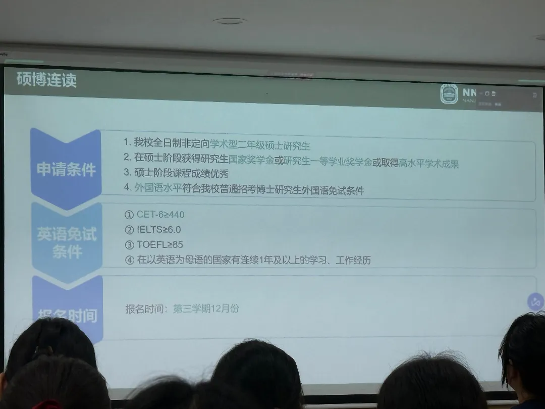 随后,蔡文君就硕士和博士阶段的毕业要求作出说明,重点介绍了博士研究生申请学位所需的科研成果条件,以及硕士研究生修读学分和完成学位论文的基本要求。他以时间轴形式清晰梳理了学位论文推进的关键节点,提醒学生尽早明确科研方向、合理安排进度,特别是计划报考公务员或事业单位的同学需统筹协调学习与就业准备。他还介绍了硕博连读的申请流程与相关准备,建议有意向的学生在研一阶段提前规划。