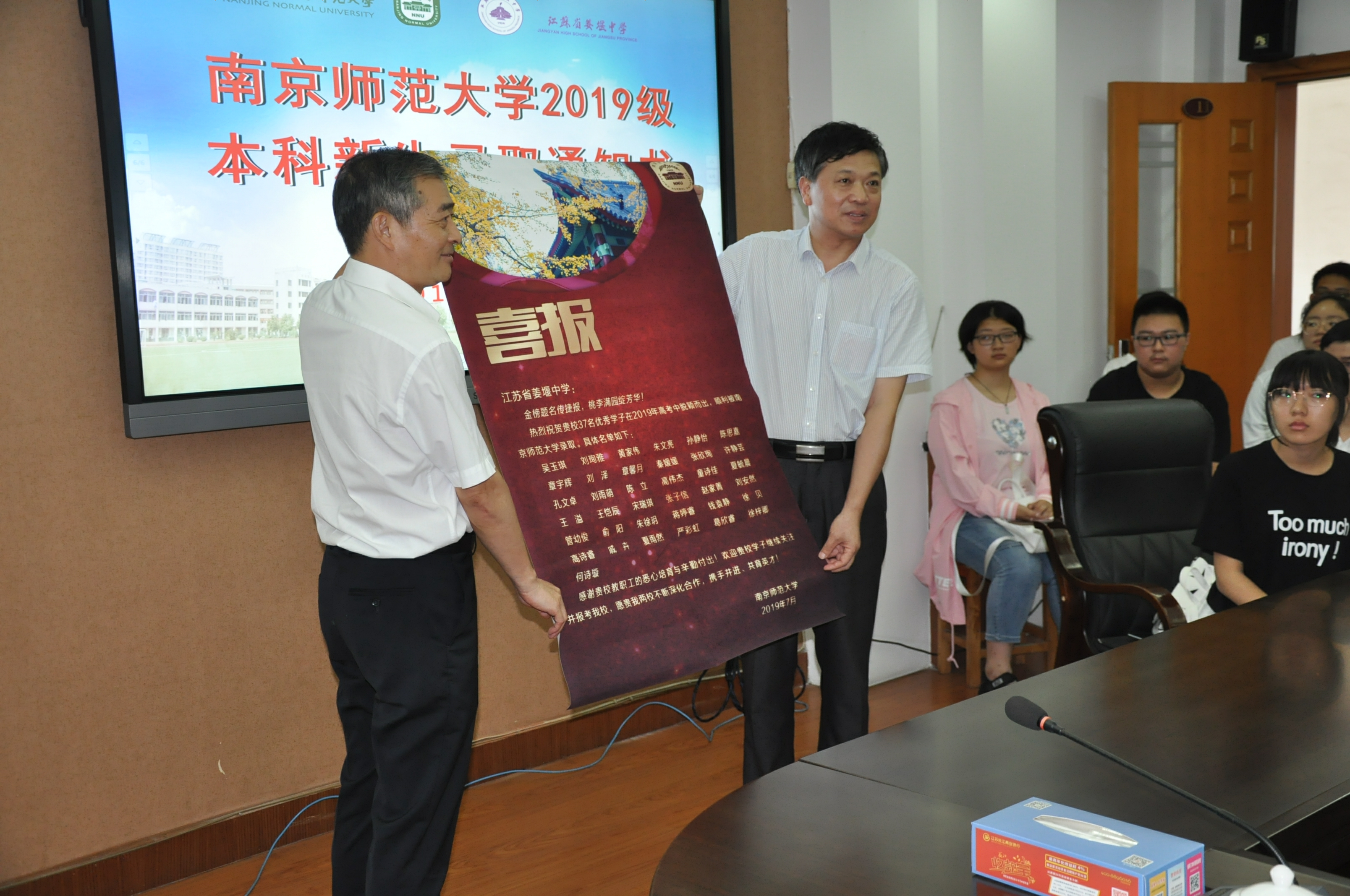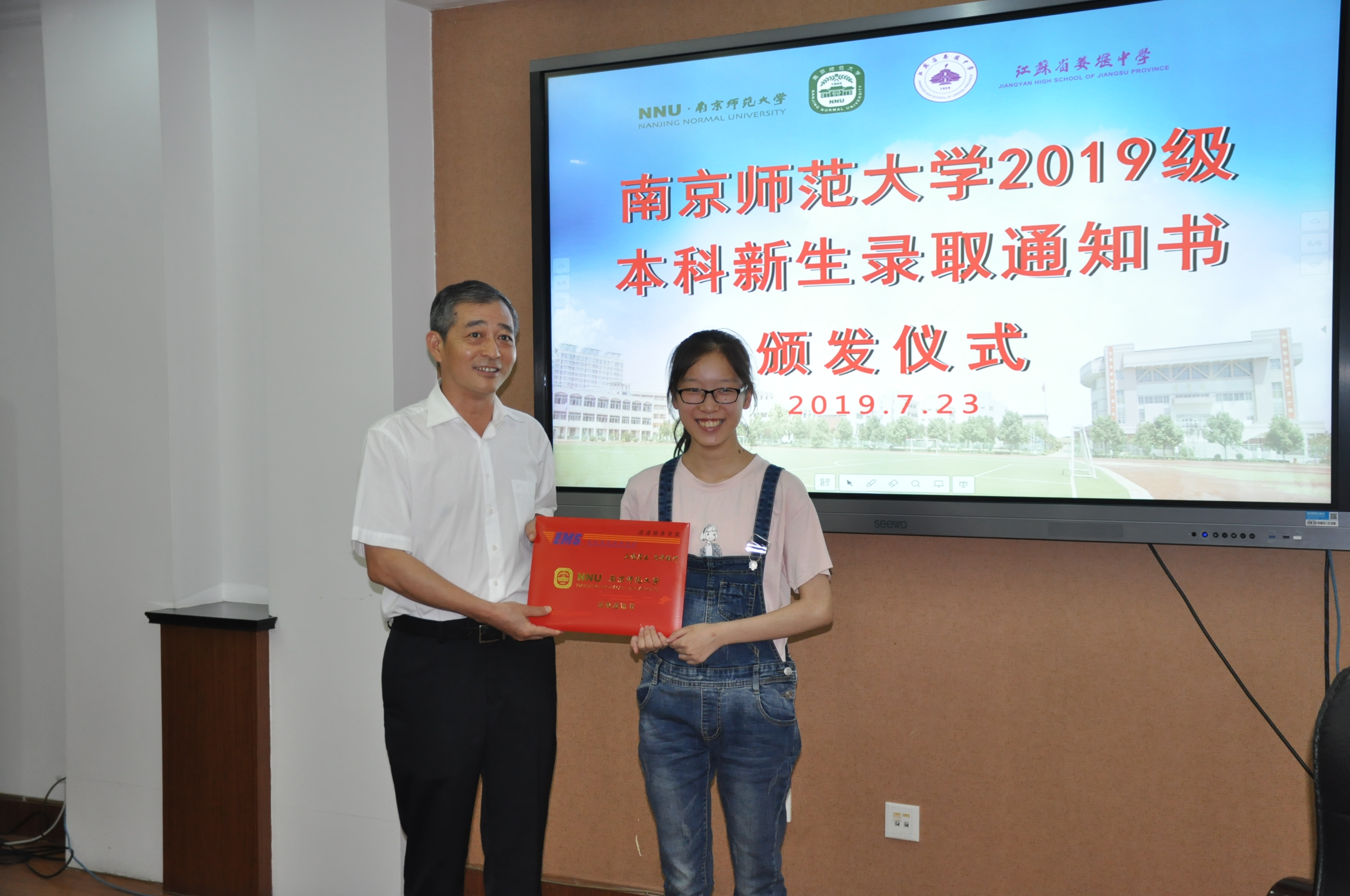 党委赵静亚书记在颁发仪式上宣读了新生录入名单及录取专业;南京师范大学李久生副校长向姜堰中学孙友新校长赠送了录取喜报。在热烈的气氛中,李久生副校长逐一为37名2019级新生们颁发了录取通知书。随后,新生代表、录取在数学类专业的孙静怡同学发言,她由衷感谢姜堰中学校领导、老师们的三年来的辛勤培育,并表示在今后的南师学习中坚持不懈,刻苦钻研,学出滋味,学出成就。网赌-网赌平台推荐
