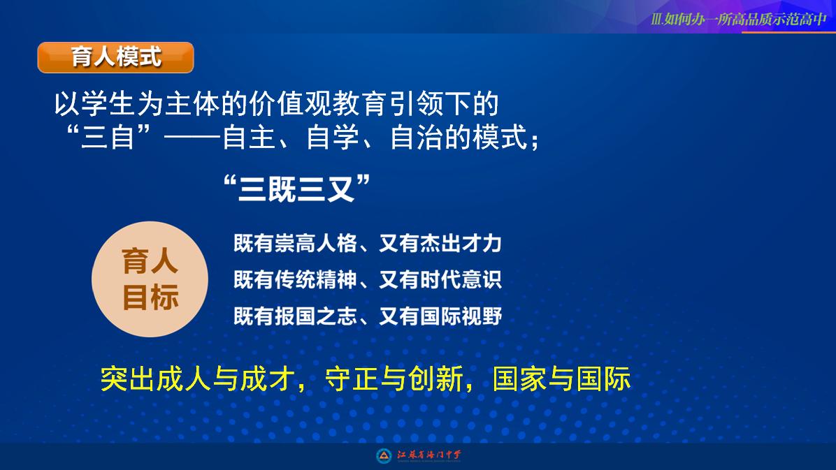 报告中,石鑫校长从近年来海门中学的教育事业发展出发,以高品质的“办学理念”、“学校课程”、“师资队伍”、“管理机制”、“学校文化”、“办学业绩”六个方面阐述了新时代赋予中等教育的客观要求,特别指出了当前在卓越教师培养背景下师范生专业发展的途径和内涵,着重强调了把培养、践行社会主义核心价值观落实在学校教育中的重要性。