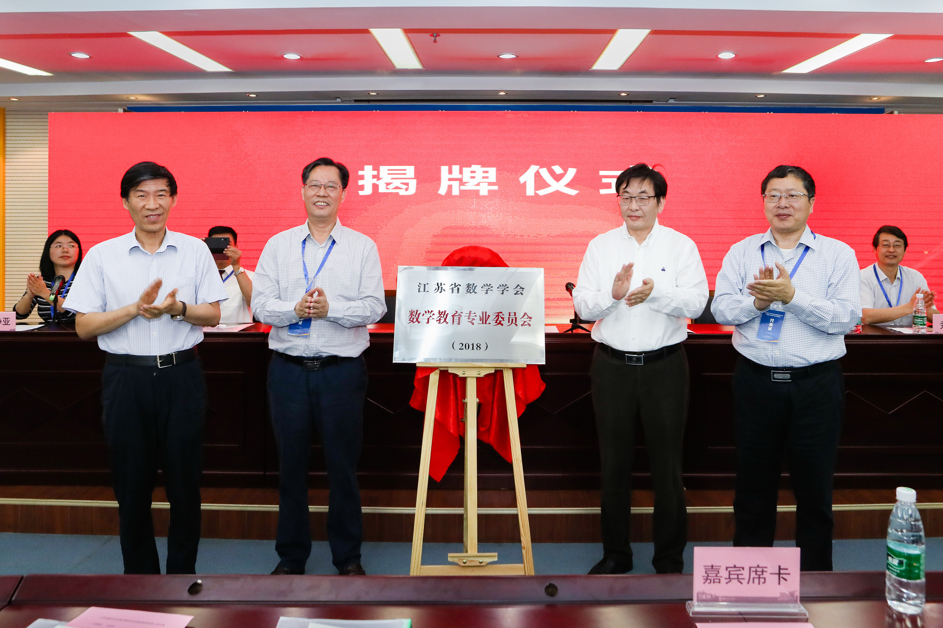 会议现场随后举行隆重的揭牌仪式。杨文新副巡视员、宋永忠教授、田立新副校长、秦厚荣主任共同为江苏省数学学会数学教育专业委员会揭牌。江苏省数学学会理事长秦厚荣教授宣布了江苏省数学学会数学教育专业委员会第一届组织机构人员名单,在与会嘉宾和代表们热烈的掌声中,江苏省数学学会数学教育专业委员会宣告正式成立。