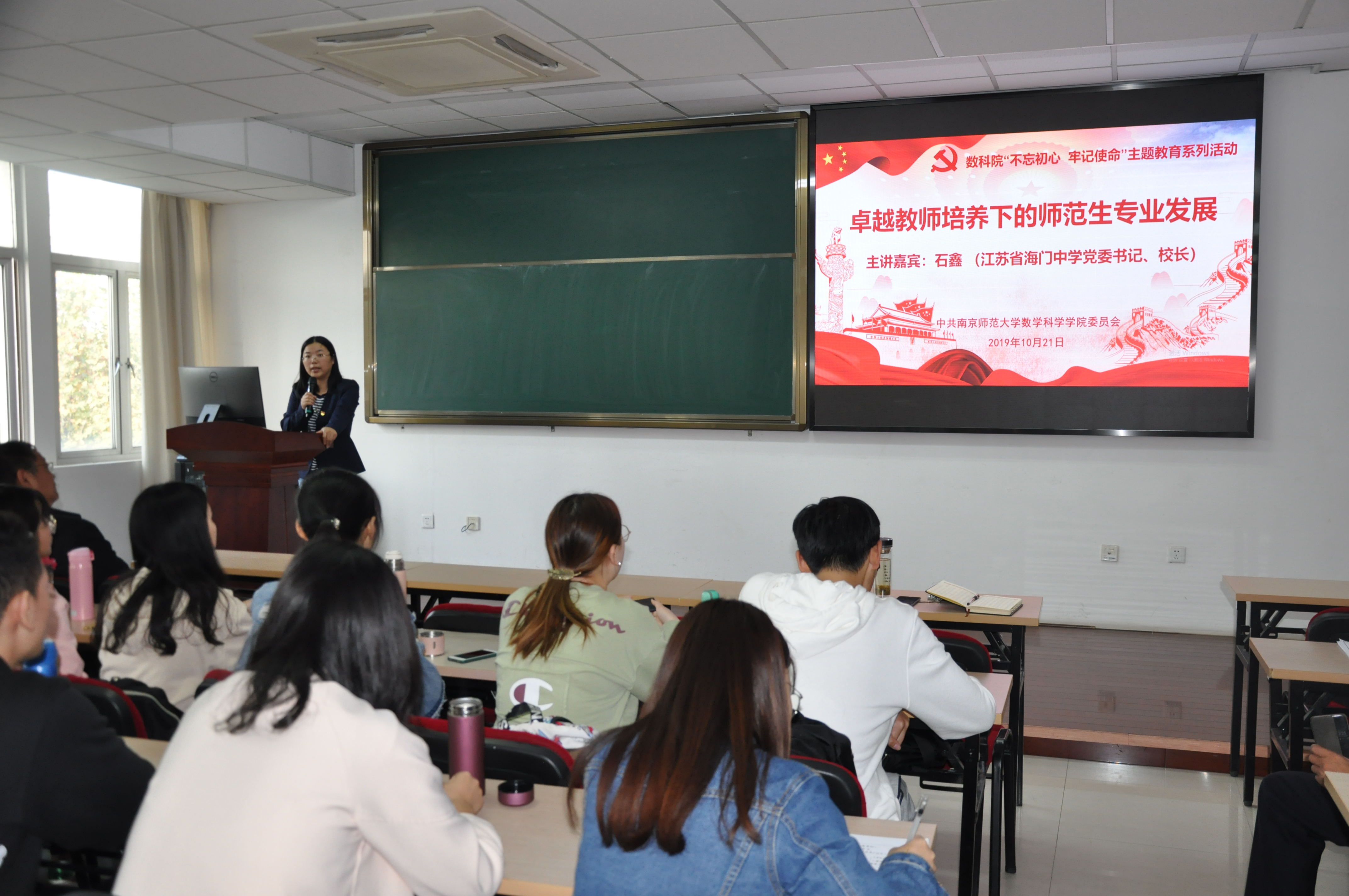 10月21日下午,应数科院党委邀请,江苏省海门中学党委书记、校长石鑫在仙林校区行健楼526室,为学院师生做了一场题为《卓越教师培养下的师范生专业发展》专题报告。来自数科院数学与应用数学(师范)专业的全体同学及部分党员教师聆听了本次报告,报告由数科院党委书记赵静亚主持。