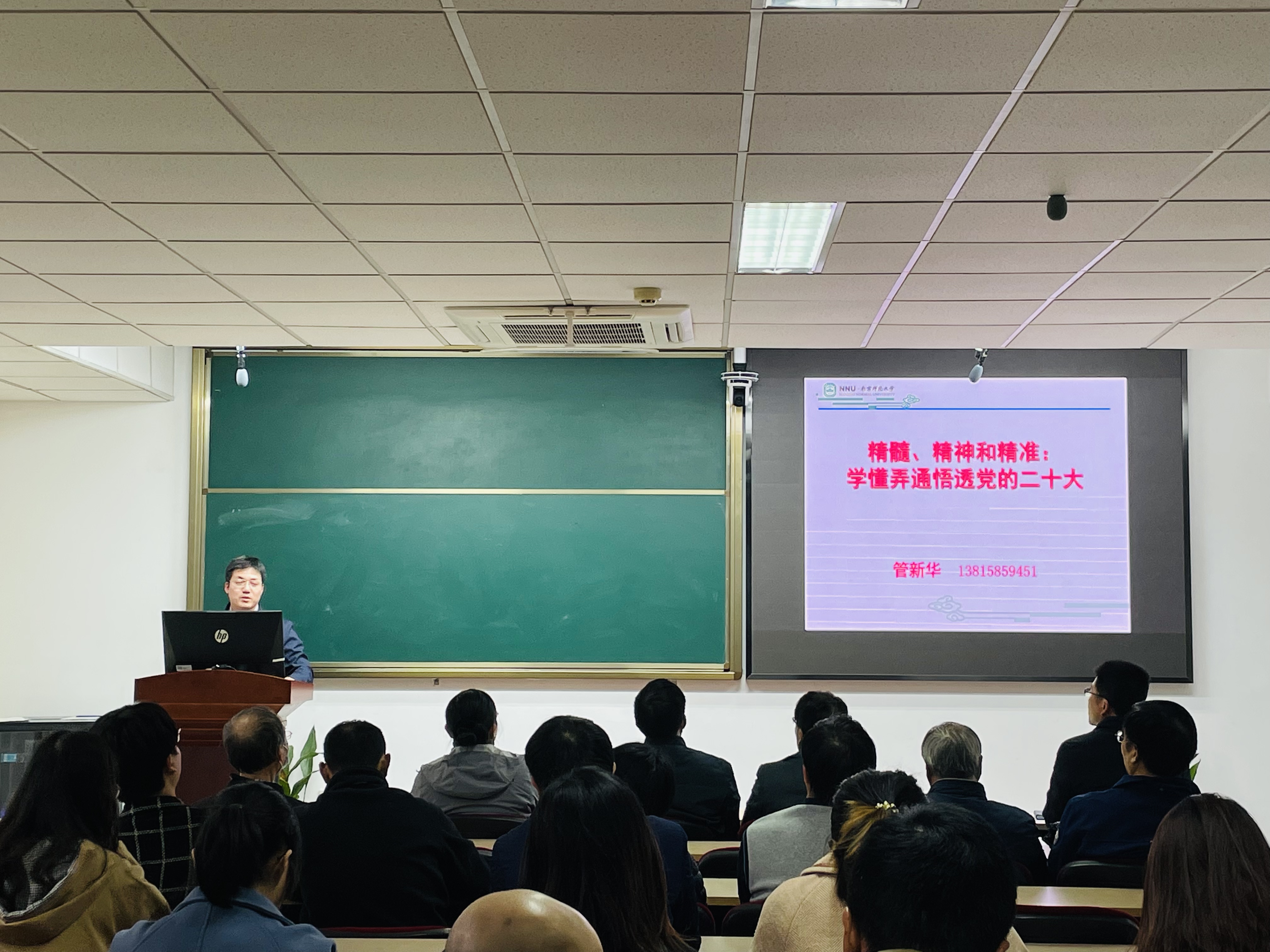 宣讲报告会在行健楼526室顺利举行,学院全体教师和学生党员代表参加学习。我校马克思主义学院管新华教授应邀作了题为《精髓、精神、精准———学懂弄通悟透党的二十大》的专题报告。报告会由院党委书记徐剑波主持。