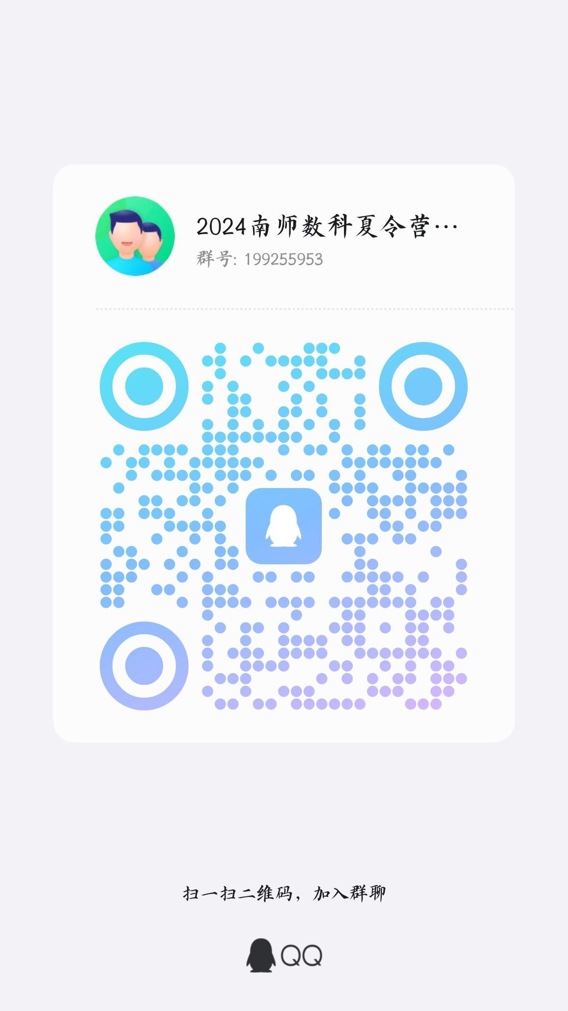 入选营员请扫描下方QQ二维码实名加入“2024南师数科夏令营(确认群)”,群昵称请实名。申请后请耐心等待,管理员会逐一审核确认。