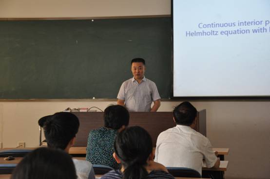 报告会上,武教授首先介绍了内罚有限元方法在高波速Helmholtz方程,二阶椭圆界面问题上的应用。在Helmholtz方程中,通过添加法向导数跳量的惩罚项,消除了高波速带来的误差污染影响。武教授提出,在二阶椭圆界面问题中,因为不同需要而采用一致非匹配网格或者两子区域用不同从尺度的网格,这样就需要在界面上添加一些函数本身跳量的惩罚项以保证解的连续性以及最优误差估计。