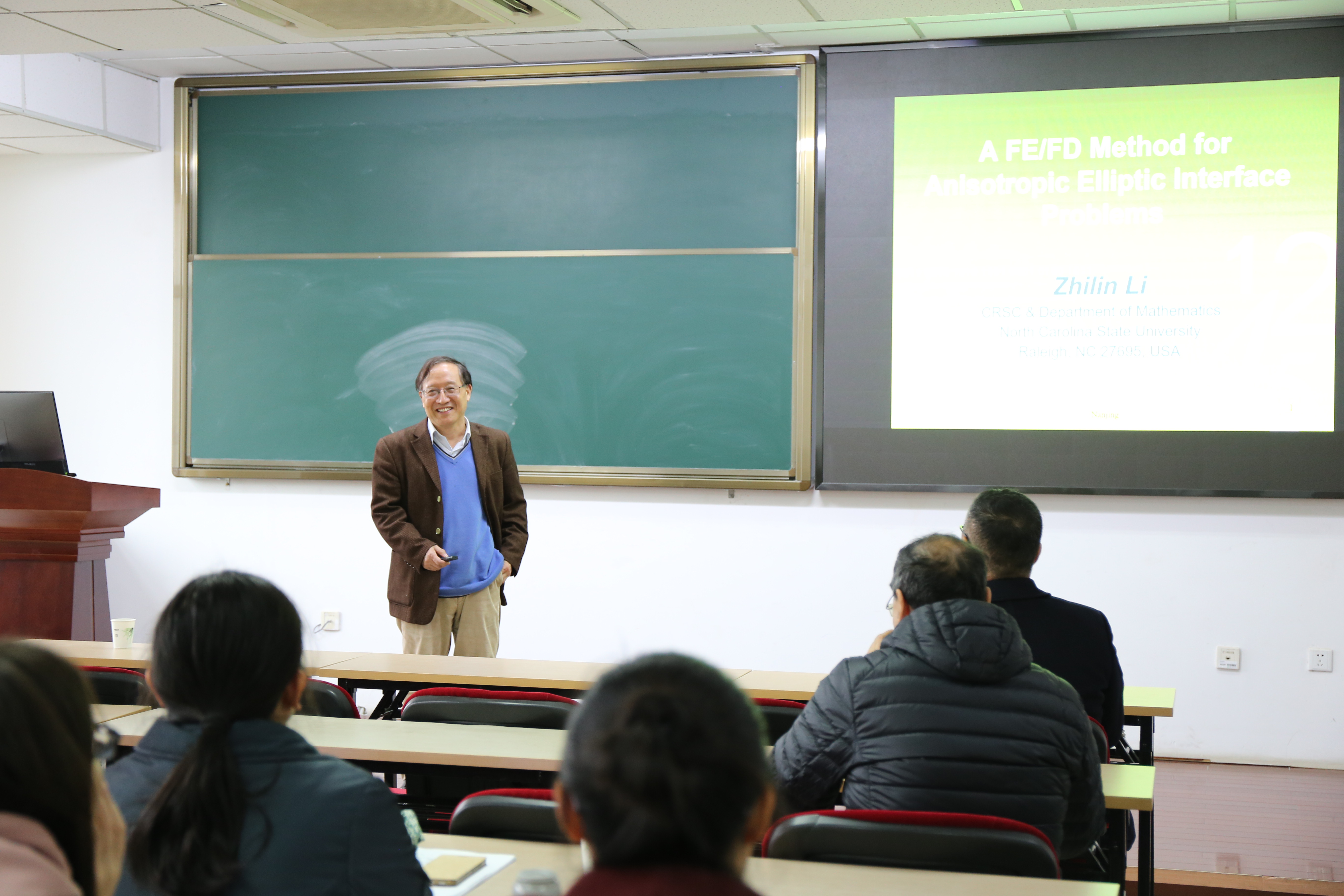 在本次报告会上,李治林教授作了题为“(A FD/FE method for anisotropic elliptic interface problems)有限差分/有限元方法求解各向异性椭圆界面问题”的学术报告。李治林教授首先生动形象地介绍了各向异性椭圆界面问题模型的背景及其在数值模拟上遇到的困难,又分析了独立使用有限元法或有限差分法求解各向异性问题时的优劣。李治林教授融合了两种方法的思想,提出了有限差分/有限元方法,得到了无穷范数意义下的最优误差估计,同时克服了计算量大的缺陷,并从数值实验上充分验证了理论结果。