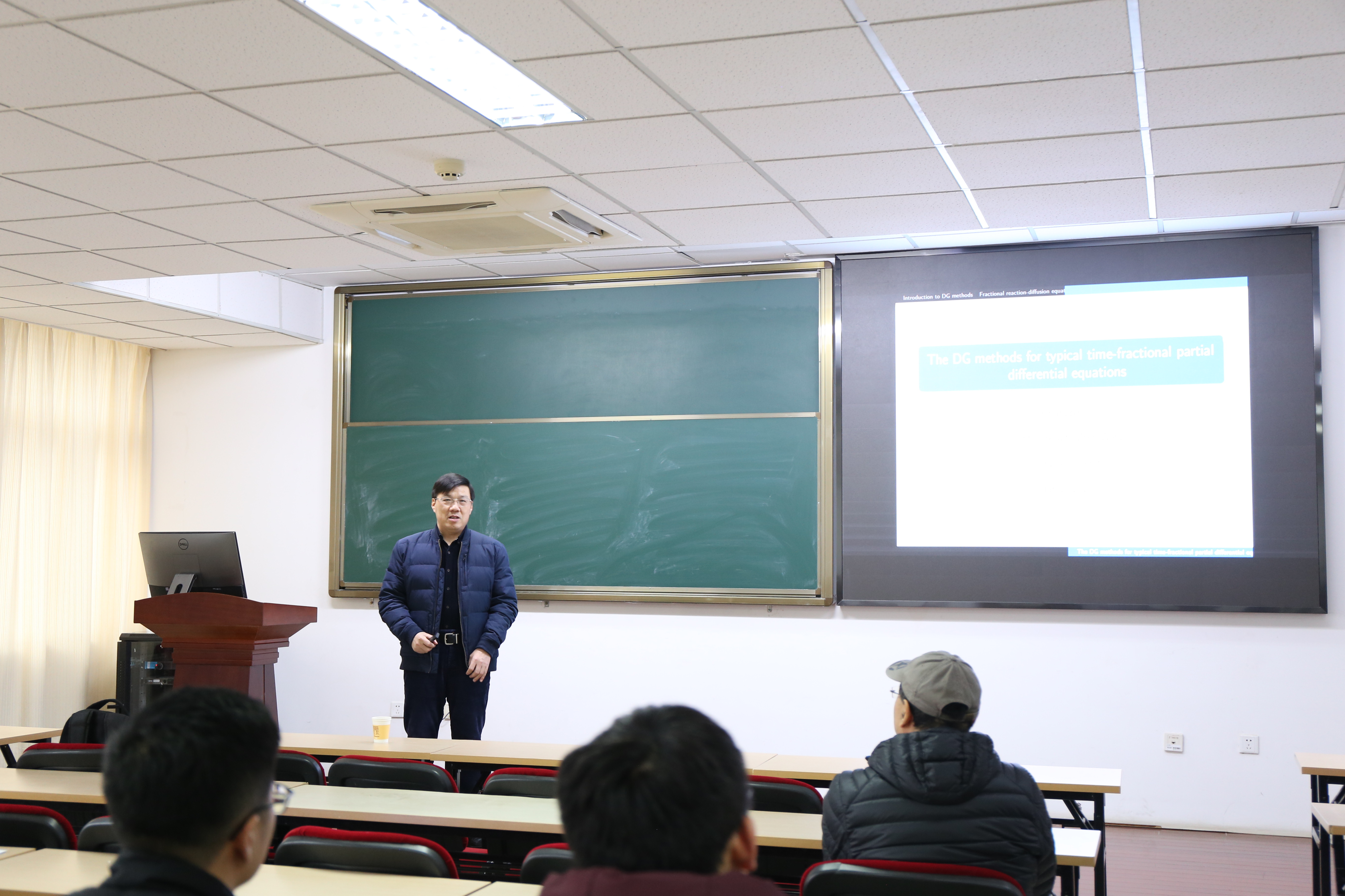 在本次报告会上,李常品教授作了题为“The DG methods for typical time-fractional partial differential equations”的学术报告。李常品教授首先向大家介绍了分数阶微积分的历史起源及其在现实生活中的应用。随后,李教授阐述了 DG 有限元方法在数值模拟中的优点,并将其应用到一系列典型的时间分数阶偏微分方程中。李教授对所研究问题进行了深入浅出的阐述,给出了三类分数阶方程正则性的理论分析,并通过数值算例论证了方法的有效性。报告中,李教授不仅介绍了自己做该问题的心路历程,还给出了几点自己做科研的宝贵心得。