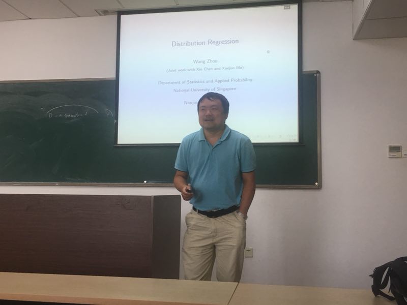 高启兵副教授的邀请,新加坡国立大学周望教授于2018年6月12日在行健楼665报告厅作了题为“Distribution Regression”的学术报告。这是校重点研究机构“金融与统计研究所”本学期第二场专题报告。数科院高启兵副教授主持了此次报告会,金融与统计研究所米辉副教授、赵媛媛副教授,及部分研究生参加了本次报告会。