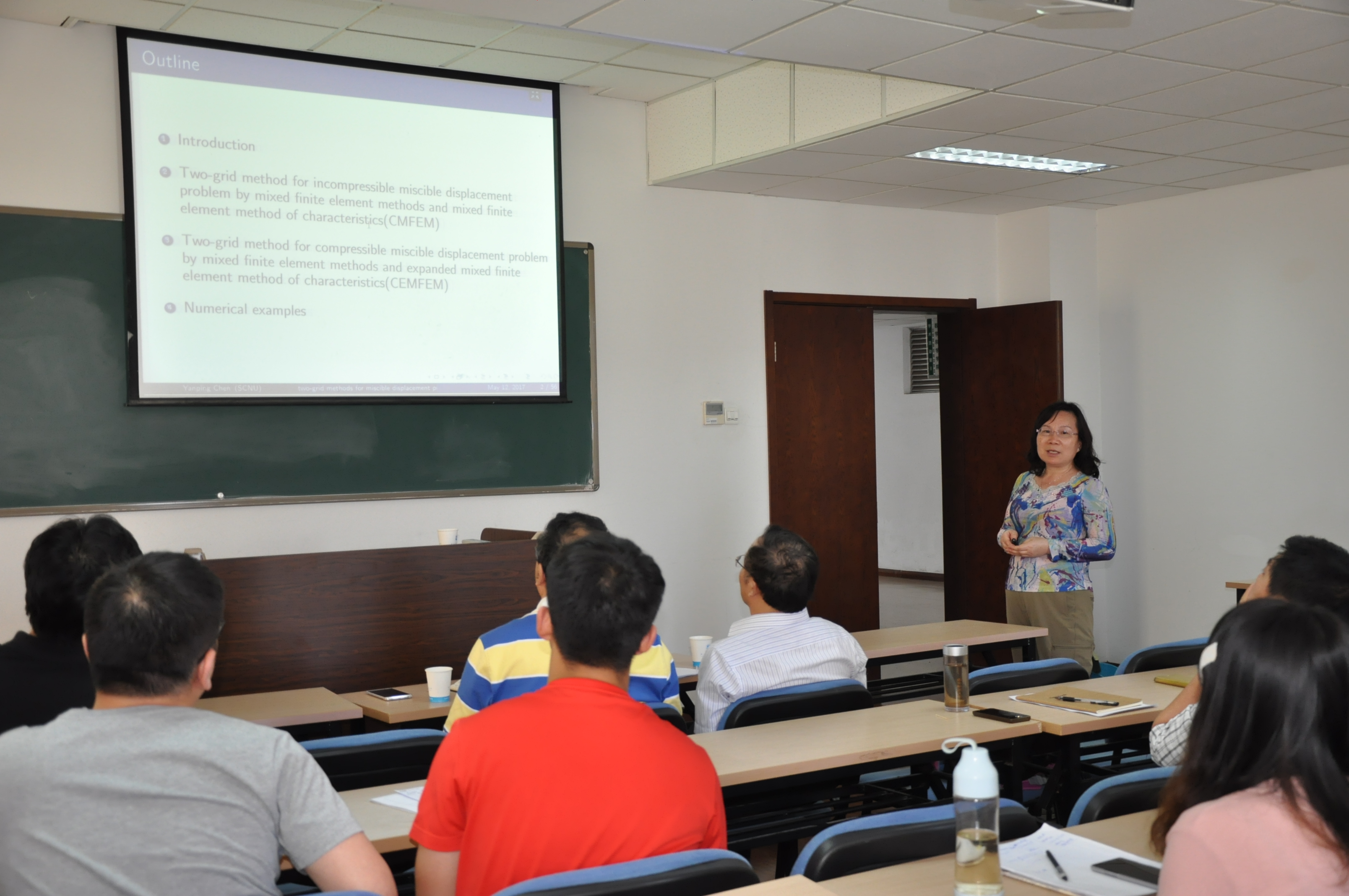 陈艳萍教授是教育部首批新世纪优秀人才,享受国务院政府特殊津贴,教育部首批高等学校优秀骨干教师,多次获得省部级自然科学奖和科技进步奖。报告会上,陈教授首先介绍了多孔介质中的不可压和可压的渗流驱动问题。为了得到该问题稳定的数值格式,陈教授结合特征性方法构造了该类问题的混合有限元方法,并给出了其收敛精度。为了更高效地求解,陈教授提出了两层网格的思想,即先对非线性的全离散格式在粗网格上求解,再对线性化后的格式在细网格上求解,数值实验表明该方法比直接用传统牛顿迭代在计算效率上有了明显地提高。