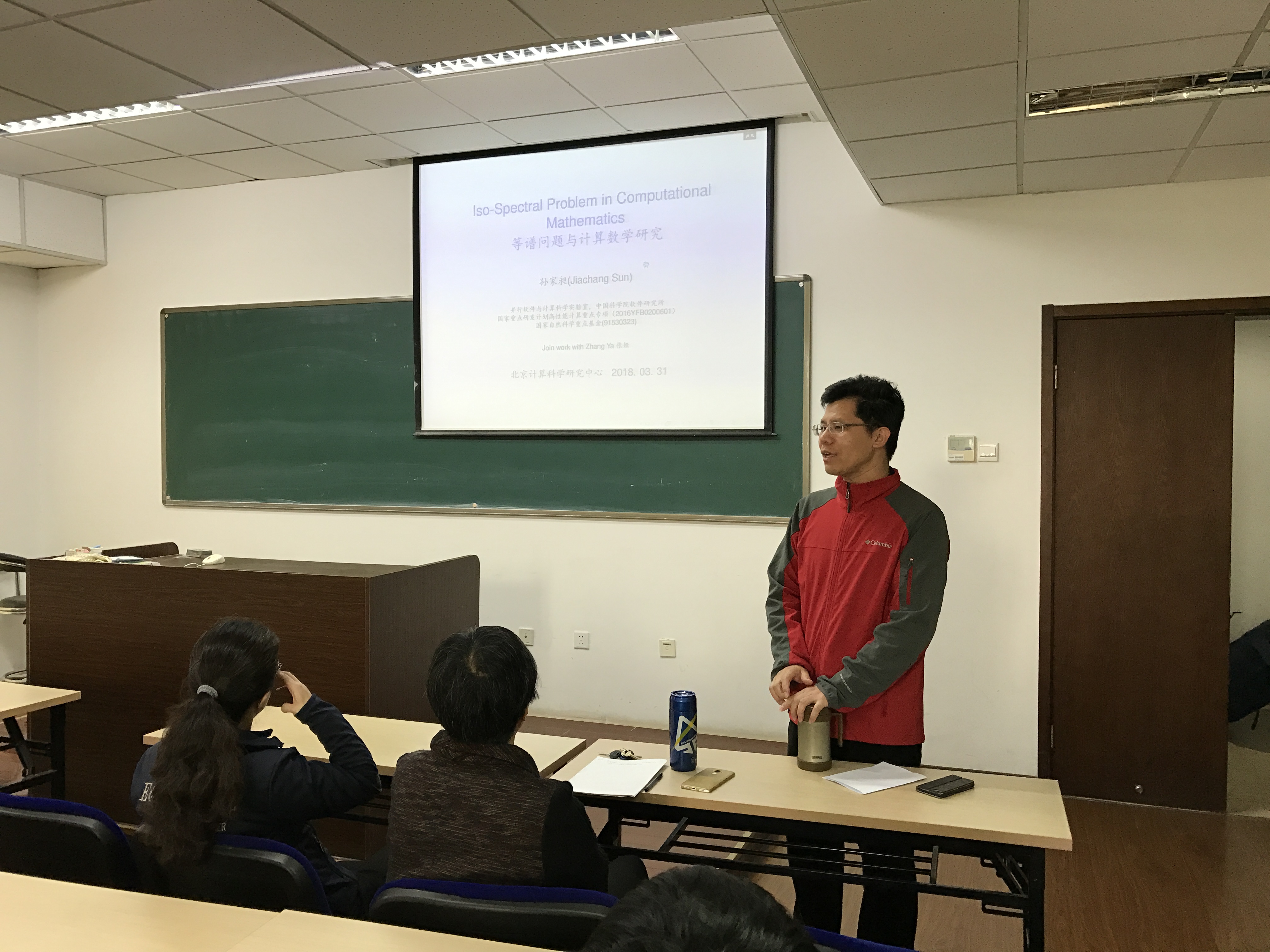 作学术报告。报告由科学计算中心主任王雨顺教授主持。王丽教授、高家全教授、陈新副教授、孙越泓副教授、王锋副教授以及计算数学专业和应用数学专业的部分学生参加了本次报告。
