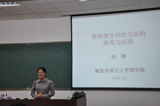2015年10月21日下午,解放军理工大学理学院赵颖教授在行健楼526室,作了题为“资料变分同化方法的研究与应用”的学术报告。省"大规模复杂系统数值模拟"重点实验室副主任、校科学计算中心主任王雨顺教授主持了此次报告会。实验室副主任陈金如教授,实验室成员孙越泓副教授、王锋副教授、谈雪媛博士、姜波博士以及计算数学专业和应用数学专业的部分研究生参加了本次报告会。