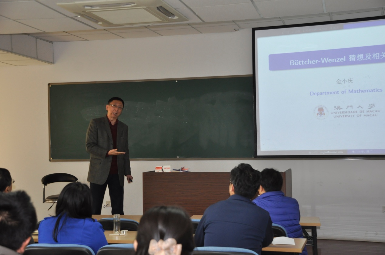 做学术报告,报告的题目是“Böttcher-Wenzel 猜想及相关问题”。科学计算中心主任王雨顺教授主持了此次报告会。学院张志跃教授、王丽教授、陈新副教授、谈雪媛博士,以及计算数学专业和应用数学专业的部分学生参加了本次报告会。