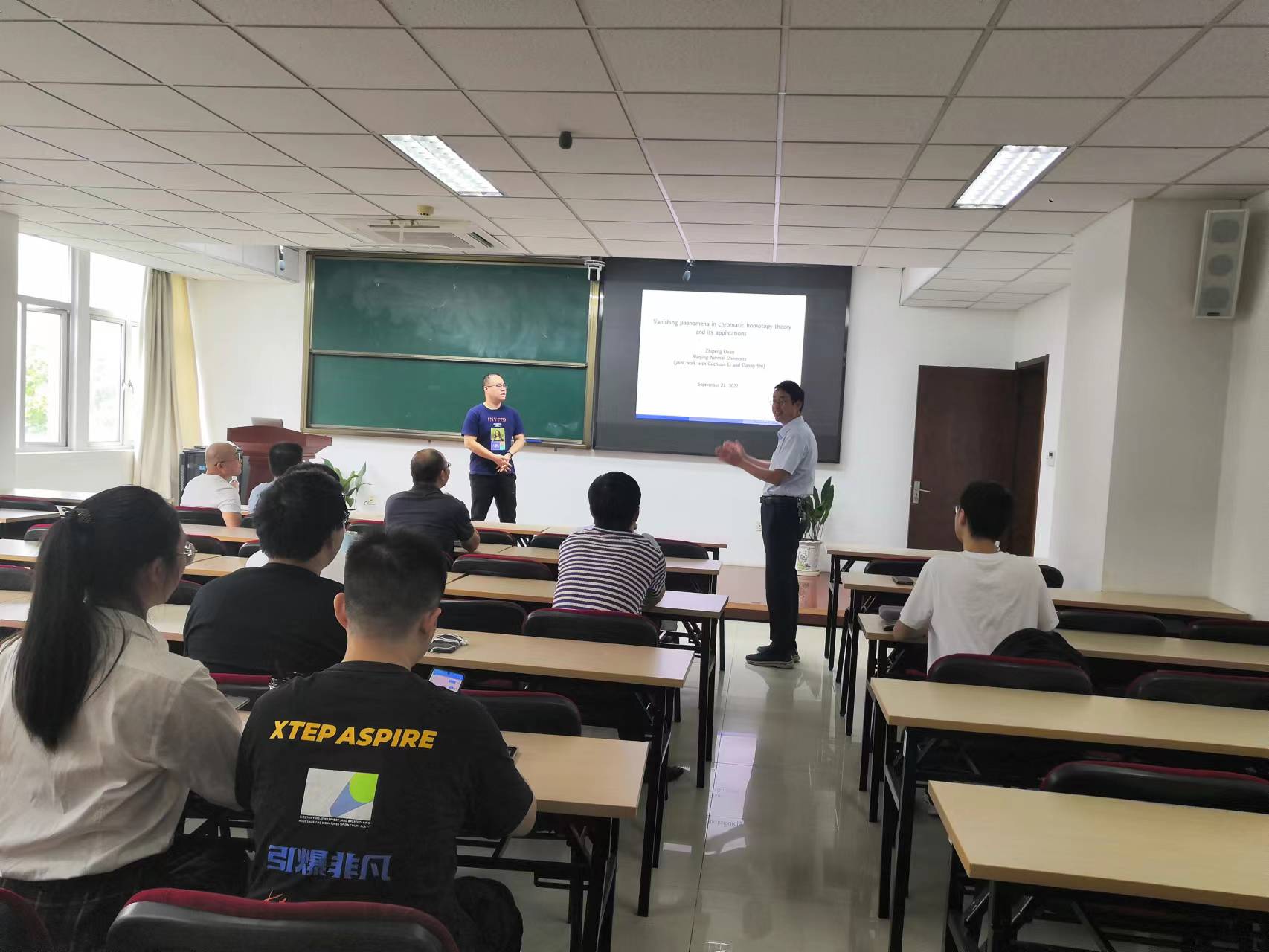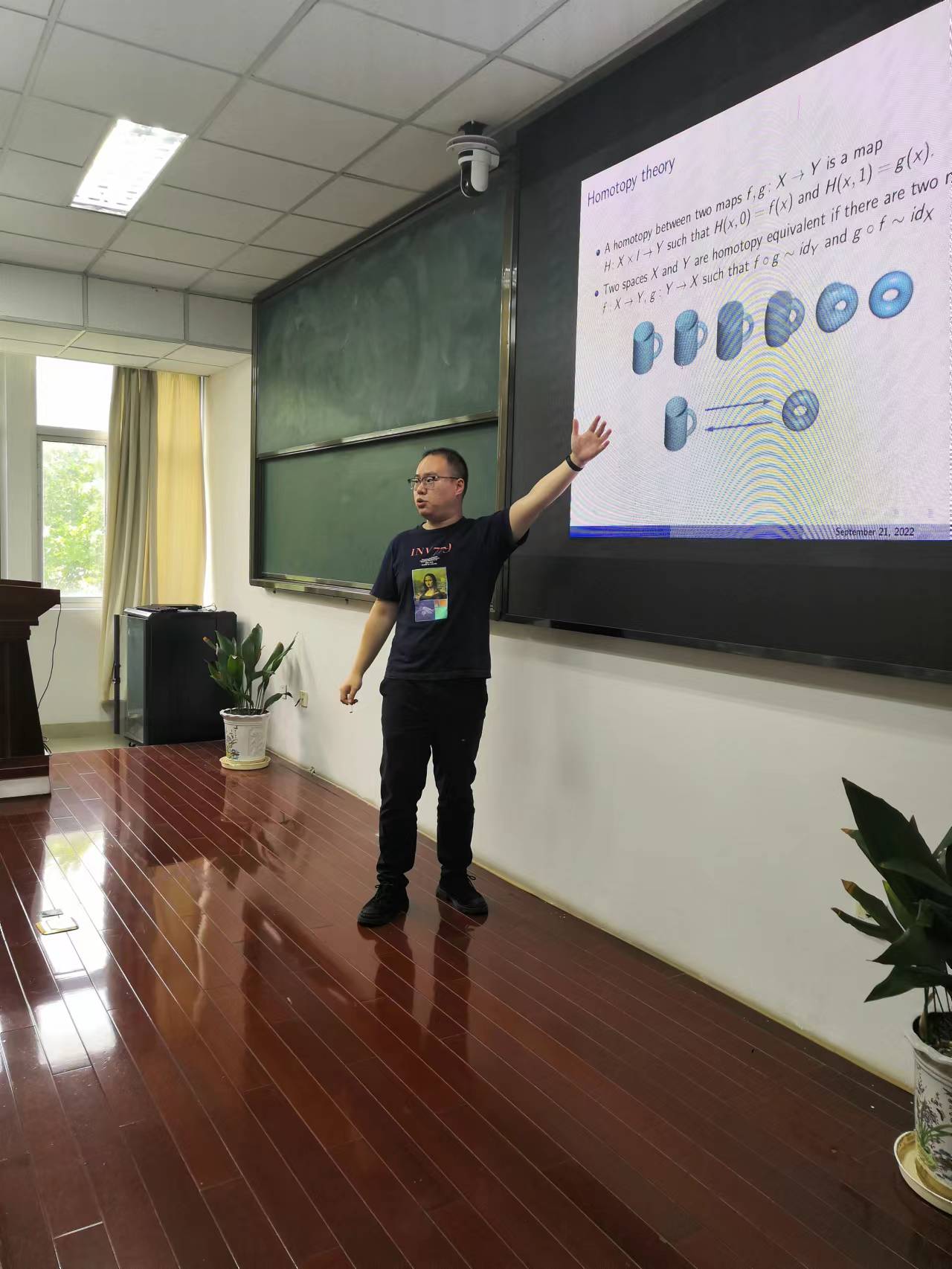 本学期第二次双周三学术报告在行建楼526举行。此次报告主讲人是几何代数研究室的段智鹏博士,报告的题目是“Vanishing lines in chromatic homotopy theory and its applications”,数学研究所执行副所长尹会成教授主持了本次报告会,数学研究所副所长贺伟教授,几何代数研究室纪春岗教授、陈慧斌副教授、张海诚副教授、薛非博士,金融数学研究室刘正威博士,以及学院部分研究生参加了本次报告。