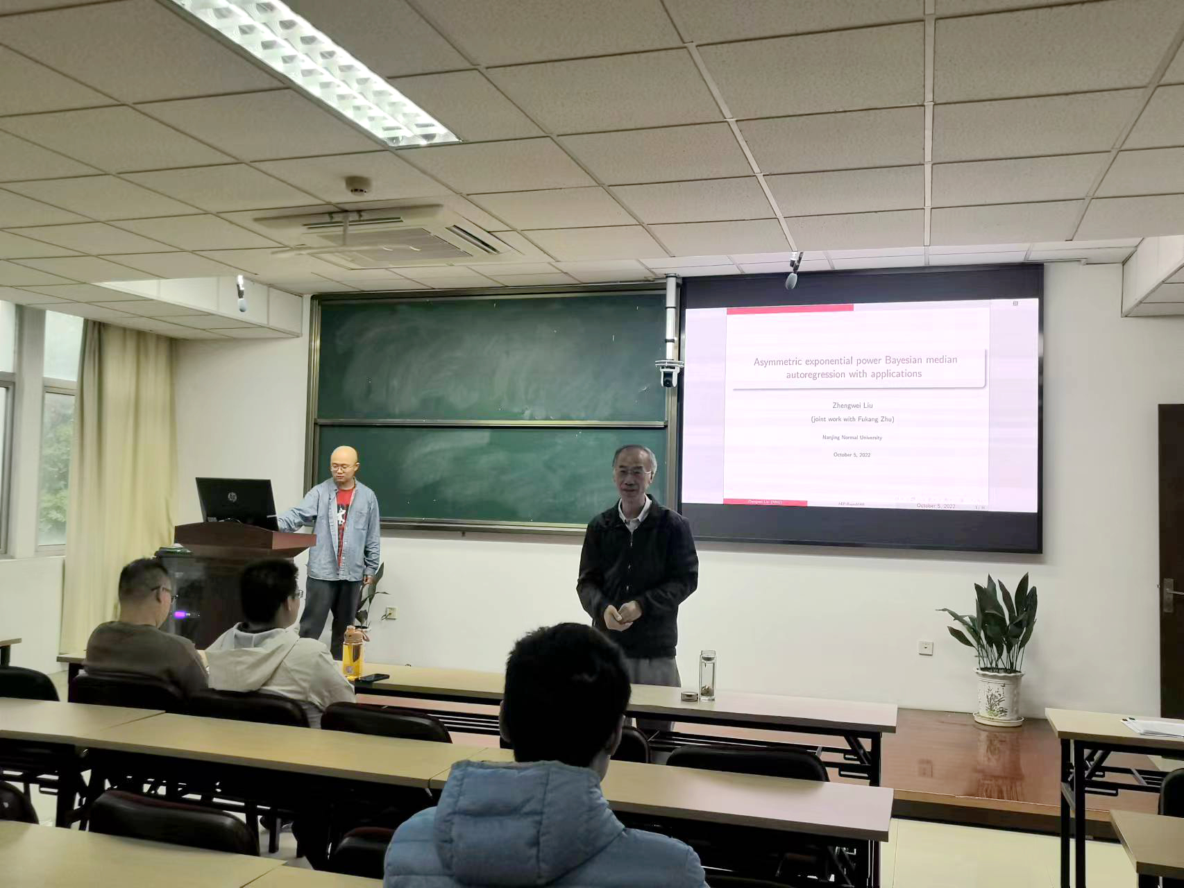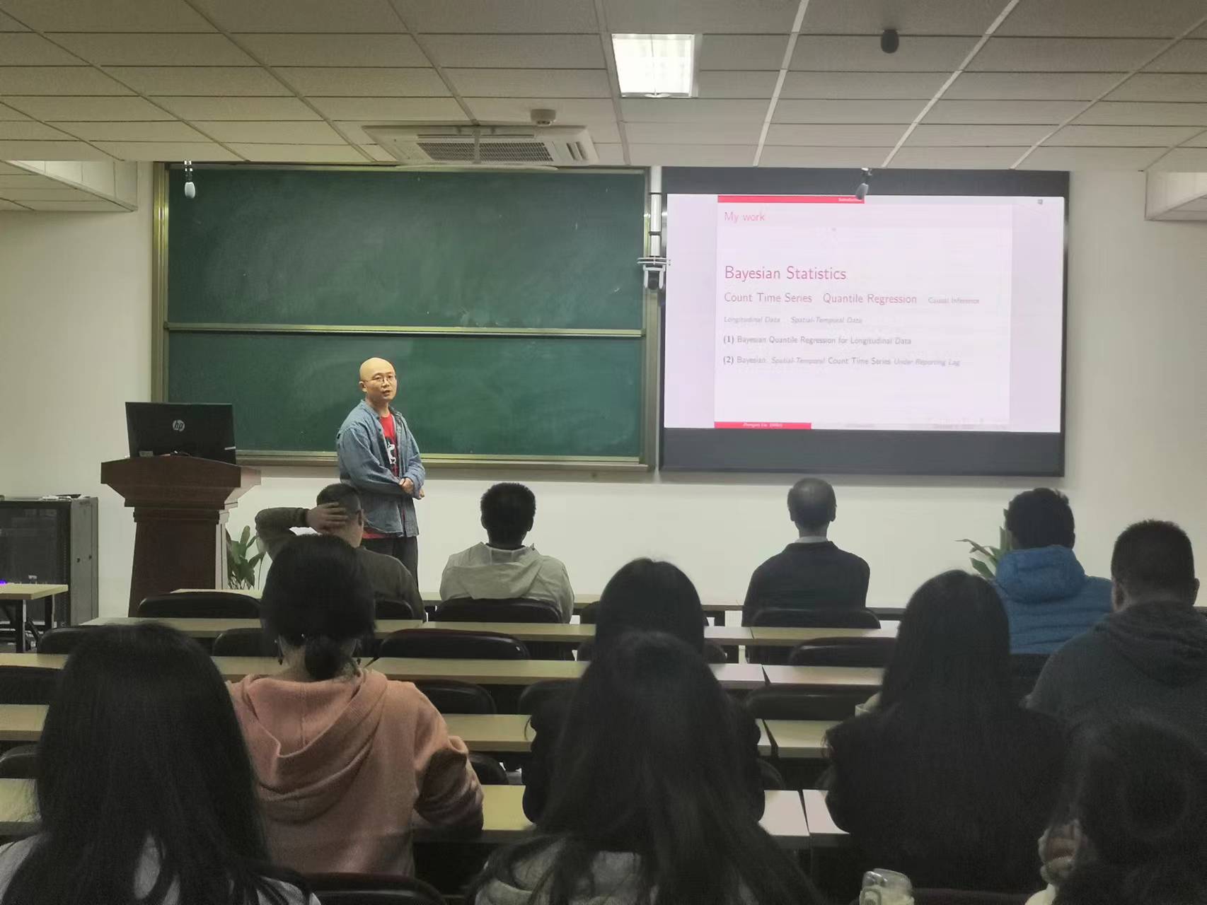 本学期第三场双周三学术报告会在行建楼526举行。此次报告主讲人是统计与金融研究室的刘正威博士,报告的题目是“Asymmetric exponential power Bayesian median autoregression with applications”,数学研究所副所长陈永高教授主持了本次报告会,数学研究所执行副所长尹会成教授,几何代数研究室薛非博士、段智鹏博士,计算科学研究室蔡文君副教授,统计与金融研究室高启兵教授以及学院部分研究生参加了本次报告。