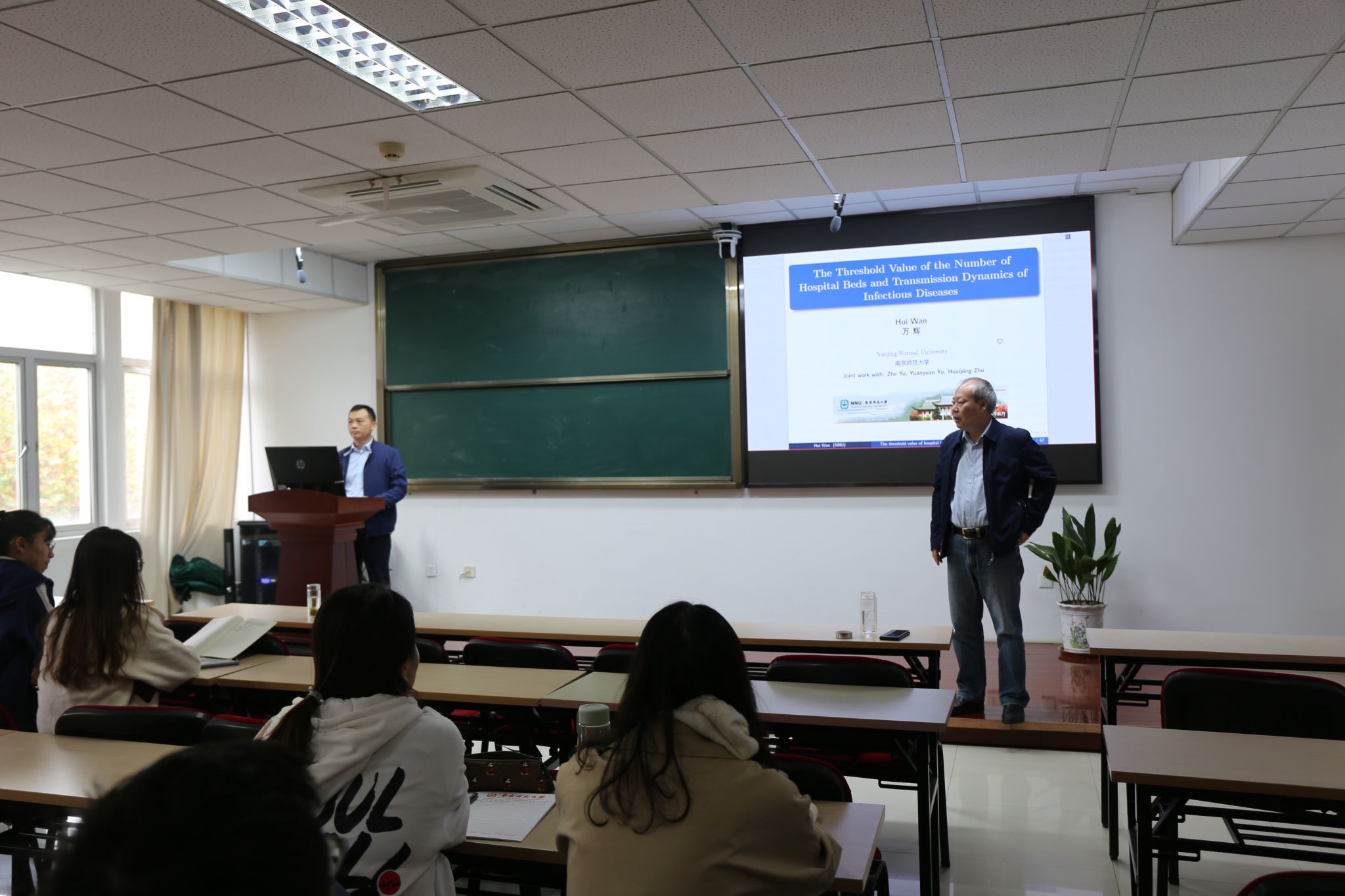 万辉教授在本次报告会中主要介绍了他引入SIHR传染病模型以描述医疗资源的有限性对传染病传播的影响,进而利用中心流形、规范性等动力系统理论分析了模型可能发生的各种复杂的动力学行为和分支现象,包括后向分支、Hopf分支、BT分支等,并计算得出了一个地区内的医院床位数量的阈值。当床位数小于这一阈值时,将基本再生数控制在1以下并不足以保证疾病一定消亡。增加病床数量达到这一阈值可以帮助人们确保疾病的最终灭绝。阈值的估计方法也可以帮助人们合理配置一个地区的医院床位数。