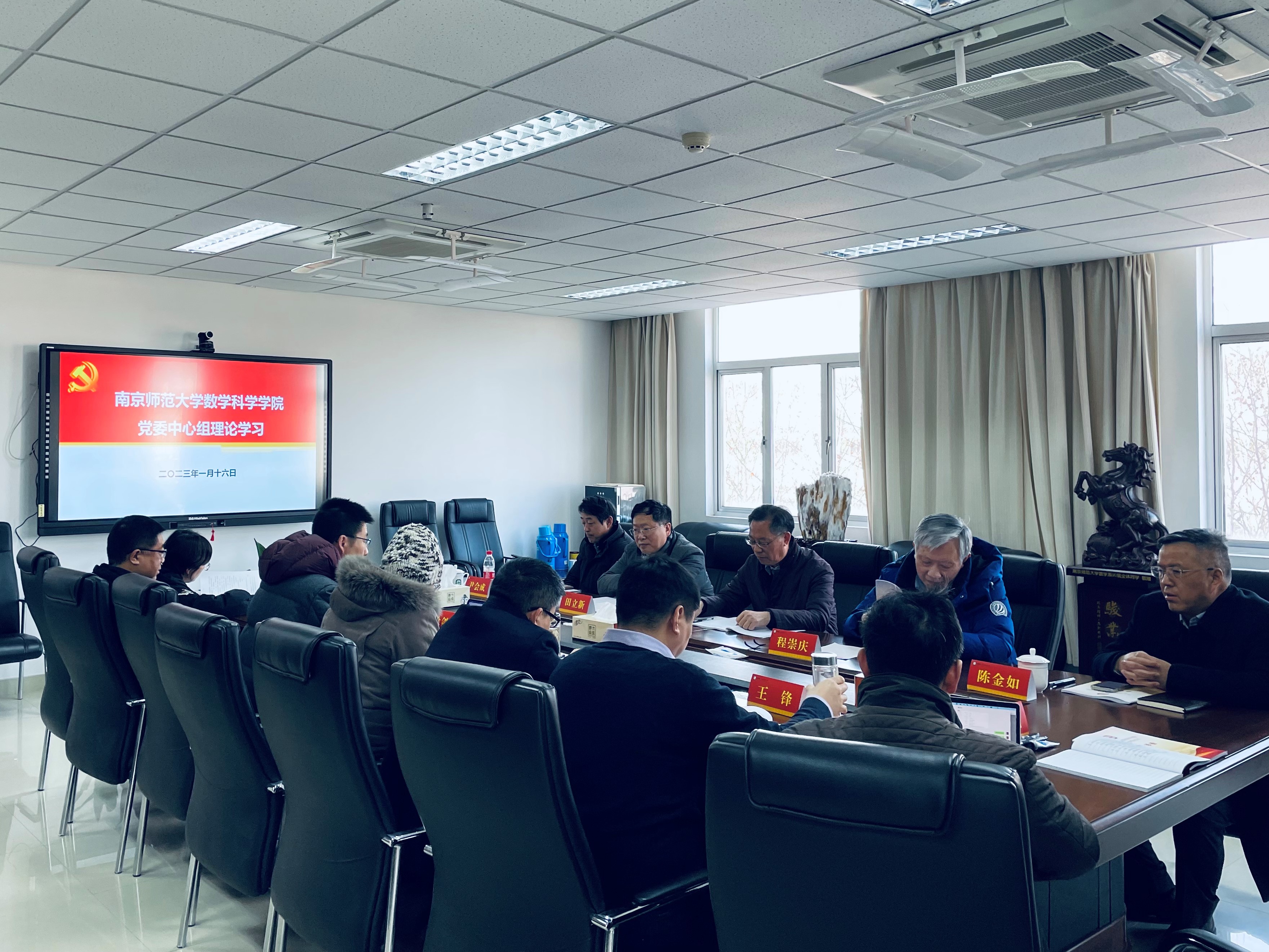 1月16日下午,数科院党委中心组理论学习研讨会在南师大仙林校区行健楼544会议室举行。学院全体党政班子成员参加集中学习。学校原党委书记、校长宋永忠,江苏省政协原副主席、学校数学研究所所长程崇庆,江苏大学副校长田立新,江苏第二师范学院党委常委、副校长陈金如,学院教授委员会主任尹会成等应邀出席研讨会。学院党委书记徐剑波主持会议。