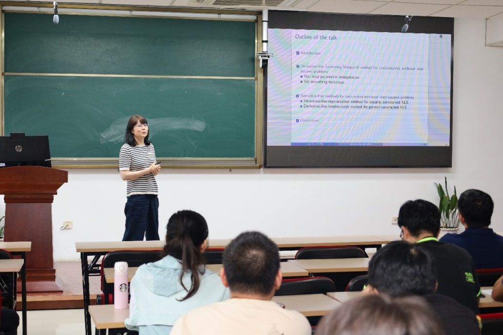 范教授报告的题目是Derivative-free methods for nonlinear least squares problems,本次报告关注的问题是非线性最小二乘问题,它在数据拟合、参数估计、函数逼近等方面有着广泛的应用,例如天气预报中的数据同化和深度学习中的评价函数的估计。在该类问题中,精确的雅可比矩阵往往不可用,通常采用概率或随机模型来替代。范金燕教授在报告中针对无约束非线性最小二乘问题,提出了一种基于概率雅可比模型的无导数Levenberg-Marquardt算法框架,并证明了当每次迭代的样本数量选择适当时,目标函数的估计和模型在概率上是准确的。该算法具有几乎必然的全局收敛性。对于具有等式约束的非线性最小二乘问题,范金燕教授提出了一种基于增广拉格朗日法和非精确牛顿类方法的无导数正则化算法,并证明了该算法的几乎必然全局收敛性。对于一般约束的非线性最小二乘问题,她还介绍了一种无导数内点法,并证明了该算法在满足一定条件时可以收敛到该问题的KKT点。