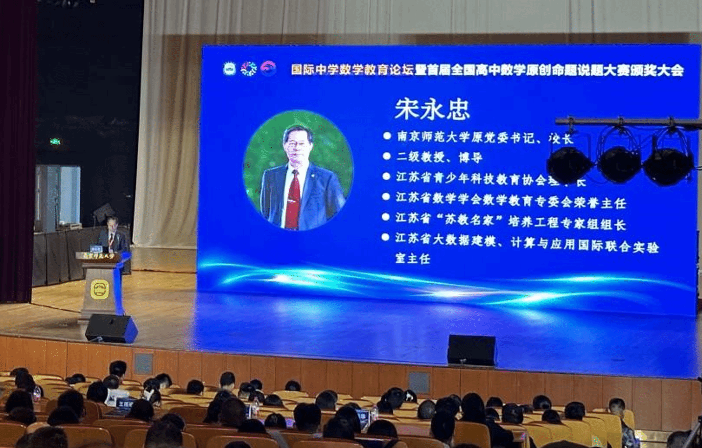 27日,第一届全国高中数学原创命题说题大赛颁奖典礼在南京师范大学仙林校区学海楼举行。此次命题说题大赛共有来自23个省、自治区、直辖市的708所学校报名参加。历时5个多月,经过3轮角逐和全国多名知名专家高标准的严格评审,最终评出特等奖7个,一等奖13个,二等奖29个。颁奖典礼后获得特等奖的老师依次分享了获奖作品。