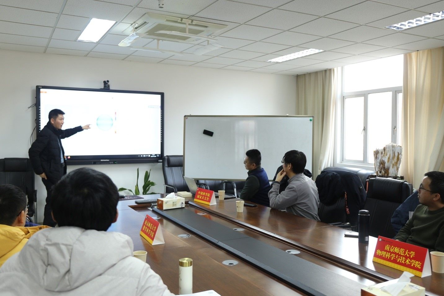 中国科学院国家天文台怀柔观测基地主任邓元勇研究员、林佳本研究员,物科院翁山杉教授、牟国斌副教授、张潇副教授,数科院尹会成教授、孙志斌教授,数科院青年教师刘亚东、寿凌云、杨云等参加了学科交叉研讨暨教育部“一部六院”科教融汇协同育人项目推进会,会议由数科院汪艳秋院长主持。