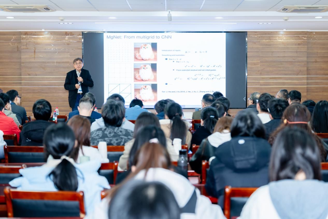 邀请,国际知名计算数学家、阿卜杜拉国王科技大学(KAUST)许进超教授于2025年3月30日上午在行健楼435报告厅做题为“有限神经元方法”的“扬芝讲坛”学术报告。报告由数科院院长汪艳秋教授主持,数科院部分教师、研究生和本科生参加。适逢数科院举办“有限元方法与深度学习数学理论研讨会”,加州大学尔湾分校陈龙教授等与会专家共同聆听了本场报告。