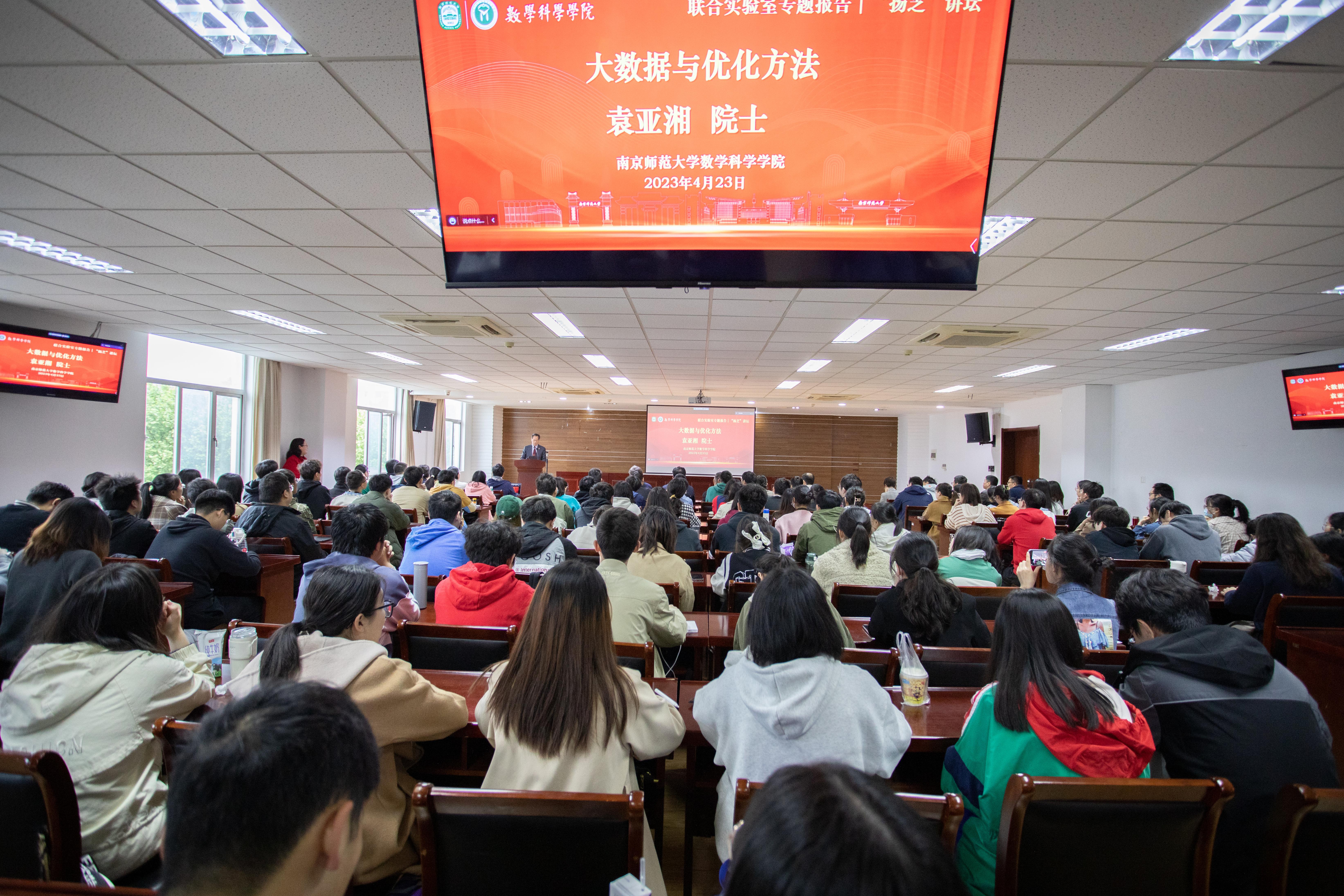 、教育部大规模复杂系统数值模拟重点实验室、江苏省大数据建模计算与应用国际联合实验室(以下简称联合实验室)的邀请,中国科协副主席、中国科学院院士袁亚湘于4月23日上午为广大师生作题为《大数据与优化》的学术报告。原南京师范大学党委书记、校长,联合实验室主任宋永忠教授主持了报告会。联合实验室联席主任、江苏大学副校长田立新教授、江苏第二师范学院副校长陈金如教授、网赌