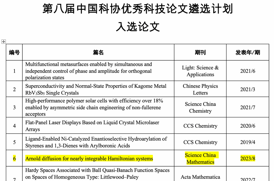 程崇庆教授与清华大学薛金鑫教授联合发表于《中国科学:数学(英文版) 》2023年第8期的论文“Arnold diffusion for nearly integrable Hamiltonian systems”入选。
