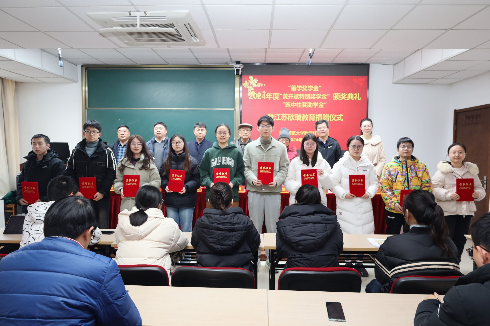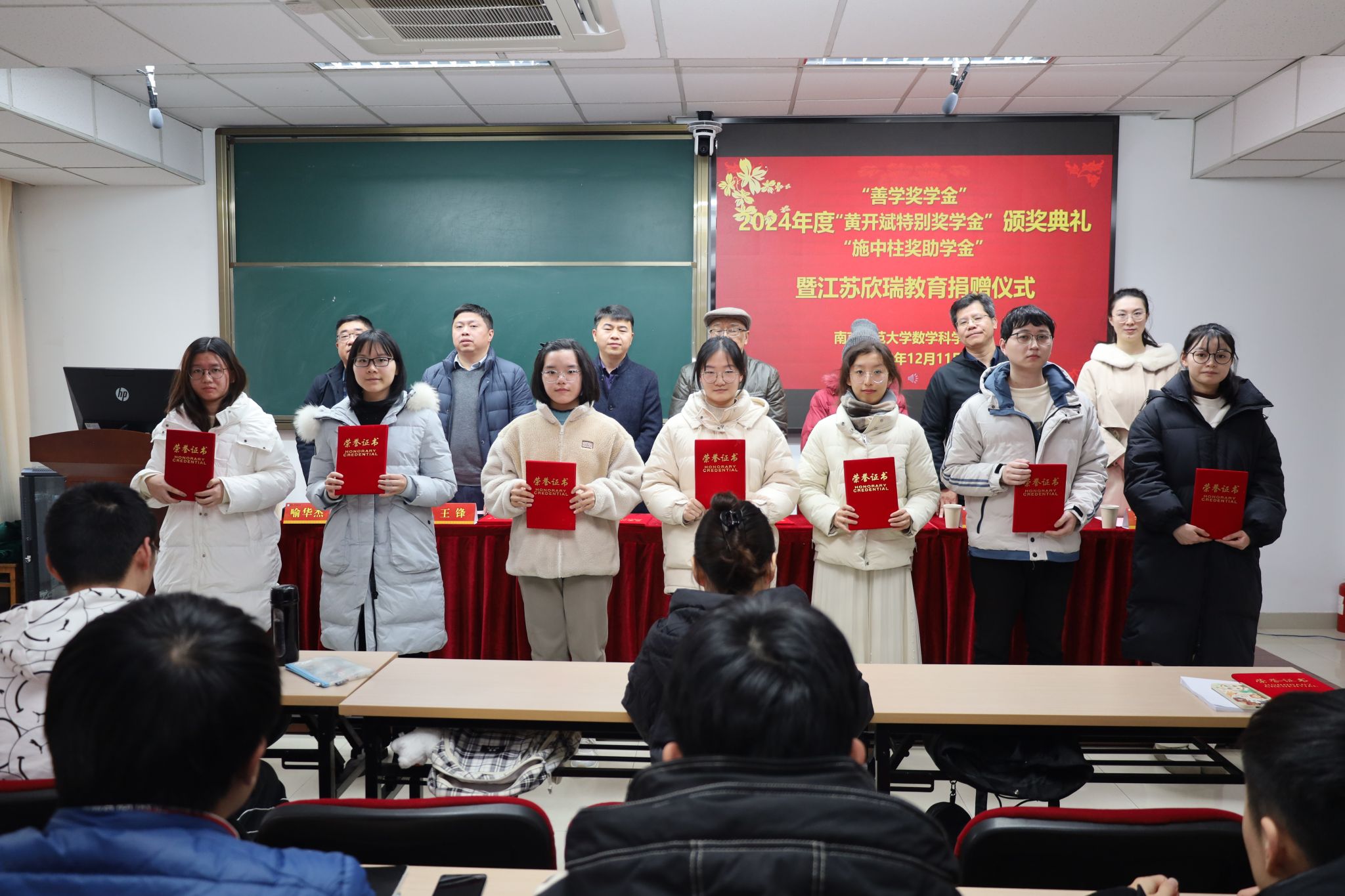 接着,数科院副院长王锋宣读了2024年度“善学奖学金”、“黄开斌特别奖学金”和“施中柱奖助学金”获奖名单,陈童瑛等14位同学获得了“善学奖学金”,陈安琪等10位同学获得了“黄开斌特别奖学金”,赵恒杨等15位同学获得了“施中柱奖学金”,王伟涛等5位同学获得了“施中柱助学金”。在充满喜悦与鼓舞的氛围中,与会嘉宾及老师们逐一为获奖同学颁发荣誉证书,并共同合影留念。