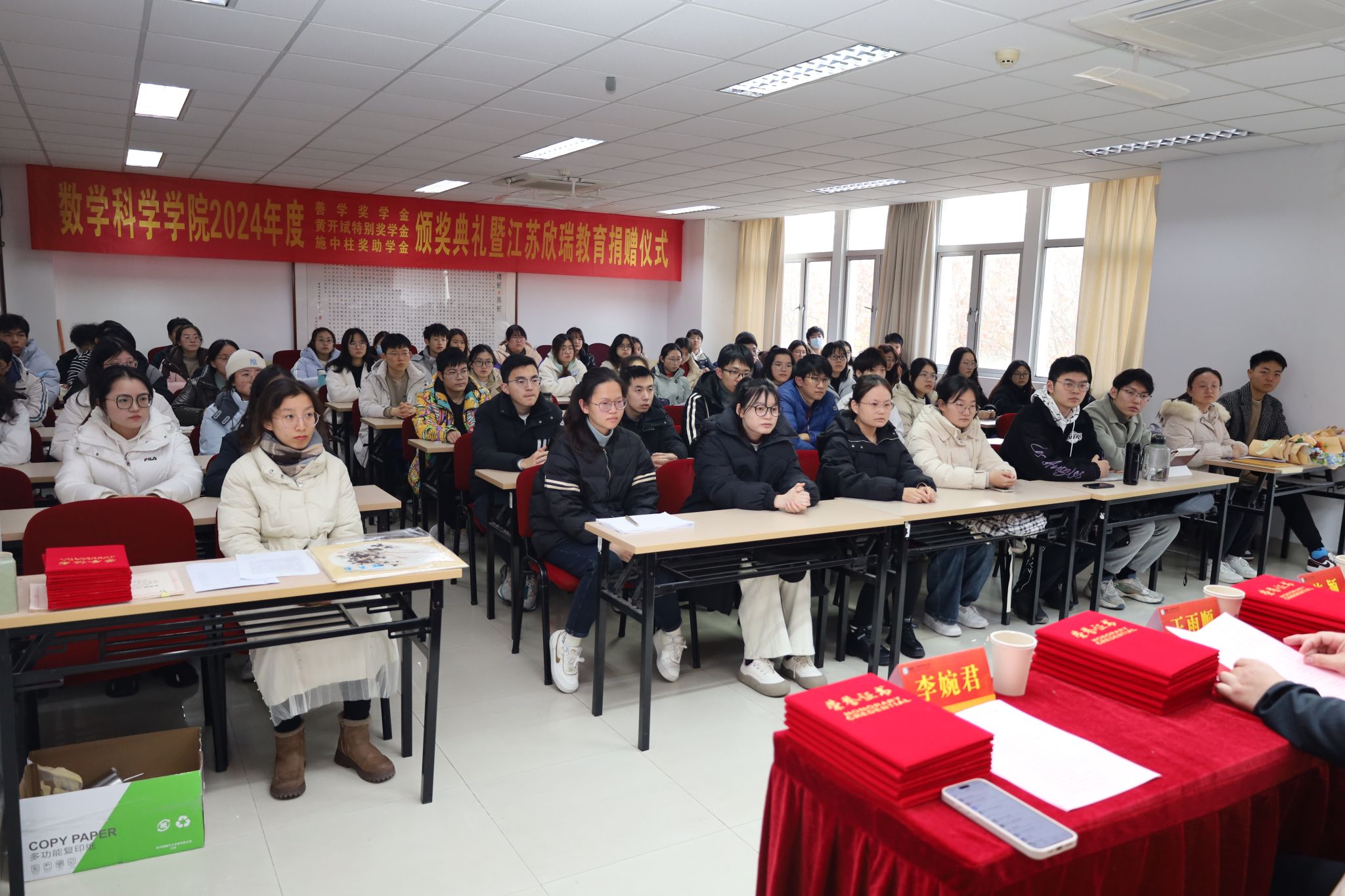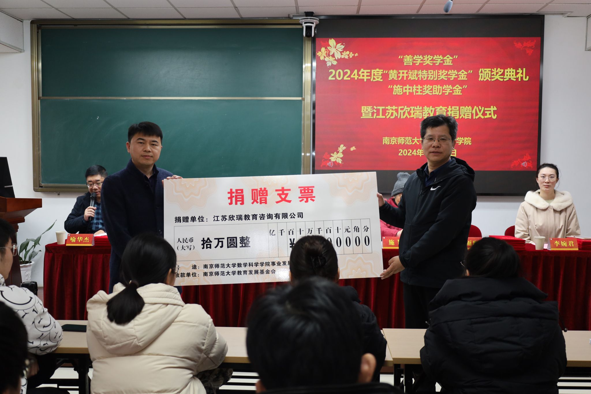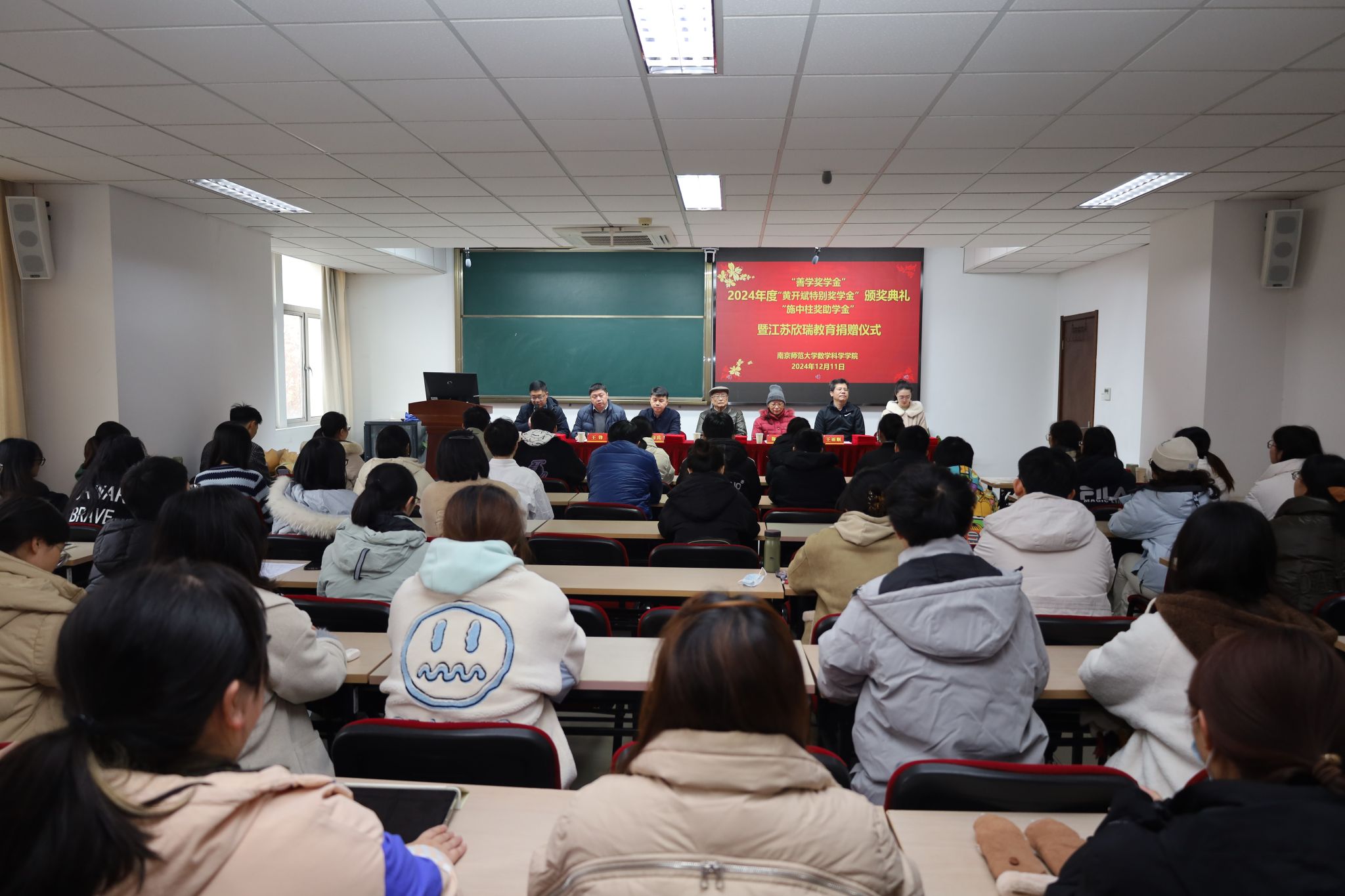 2024年12月11日,数科院2024年度“善学奖学金”、“黄开斌特别奖学金”、“施中柱奖助学金”颁奖典礼暨江苏欣瑞教育捐赠仪式在行健楼526室顺利举行。数科院原数学系主任、“善学奖学金”捐赠人单墫教授,“施中柱奖助学金”捐赠人、施中柱先生的女儿施颖女士,数科院2004届本科毕业生、优秀校友、江苏欣瑞教育咨询有限公司总经理邓海兵先生,数科院党委书记王雨顺、副书记喻华杰,副院长王锋,院团委书记李婉君等老师出席了本次颁奖暨捐赠仪式,来自三项奖助学金获奖的本、硕、博四十余名同学及部分学生代表共同参加了仪式,仪式由数科院党委副书记喻华杰主持。
