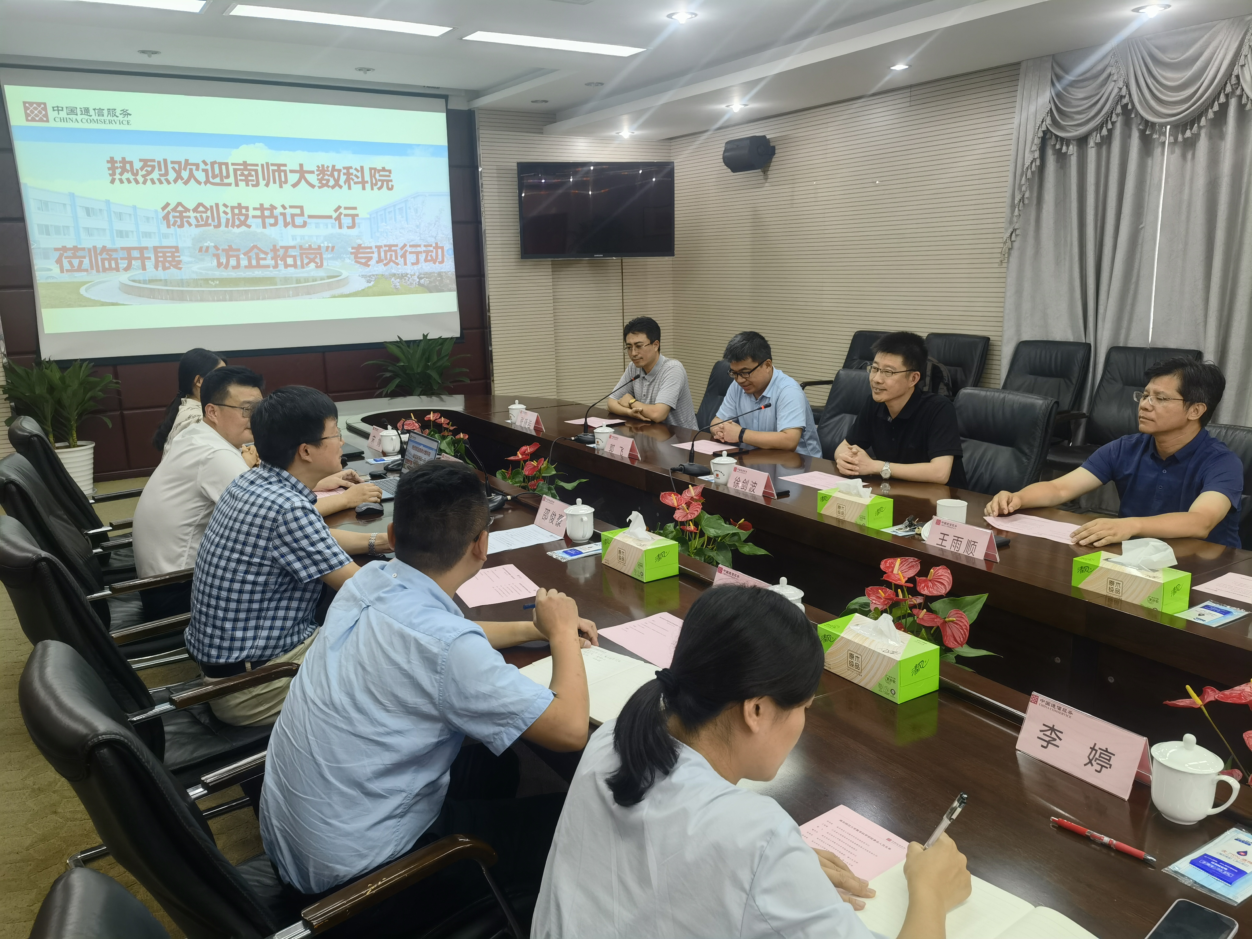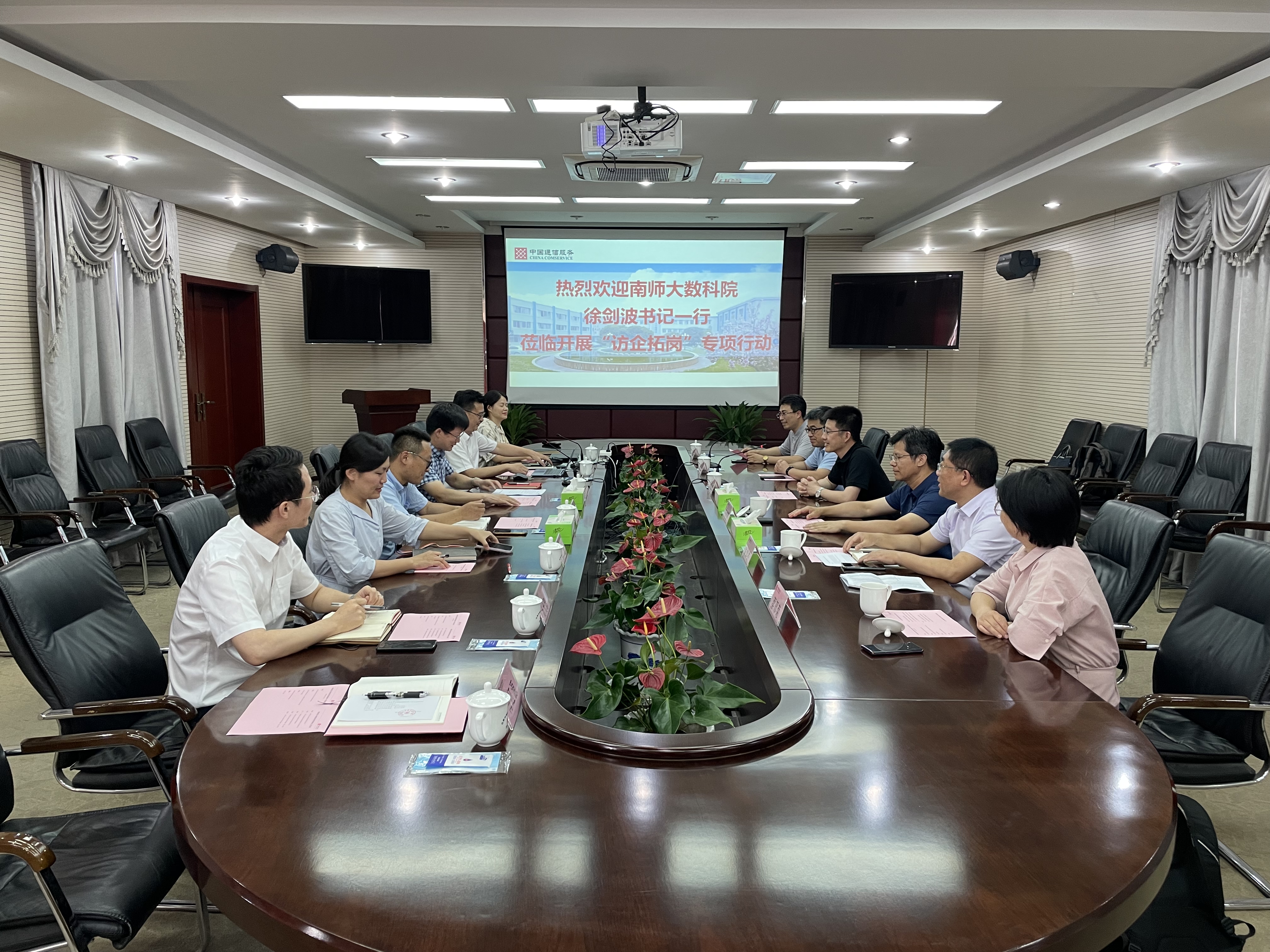 为贯彻落实党中央、国务院以及江苏省委、省政府关于“稳就业”“保就业”决策部署,积极响应学校开展“访企拓岗促就业”专项行动,进一步助力学院毕业生高质量就业。6月14日,数科院党委书记徐剑波、江苏省大规模复杂系统数值模拟重点实验室副主任王雨顺、数科院副院长郭飞、党委副书记喻华杰、运筹控制研究室张晓岩、计算科学研究室蔡邢菊等一行6人,赴江苏中博通信有限公司开展访企拓岗专项行动,与该公司纪委书记邵俊豪、人力资源部主任郭校年、华北分公司总经理王亮、战略市场部副主任宋婧、人力资源部主任副主任李婷、高级市场专员汤允鹏、高级人力专员梅红源等进行了深入院企交流和座谈。