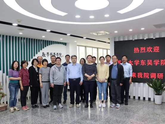2023年4月18日下午,苏州大学东吴学院副院长江美福、喻翔玮一行来网赌 调研交流。网赌 院长汪艳秋、副书记喻华杰、副院长兼大数教学部主任王锋及大学数学课程相关负责人参加了交流会。