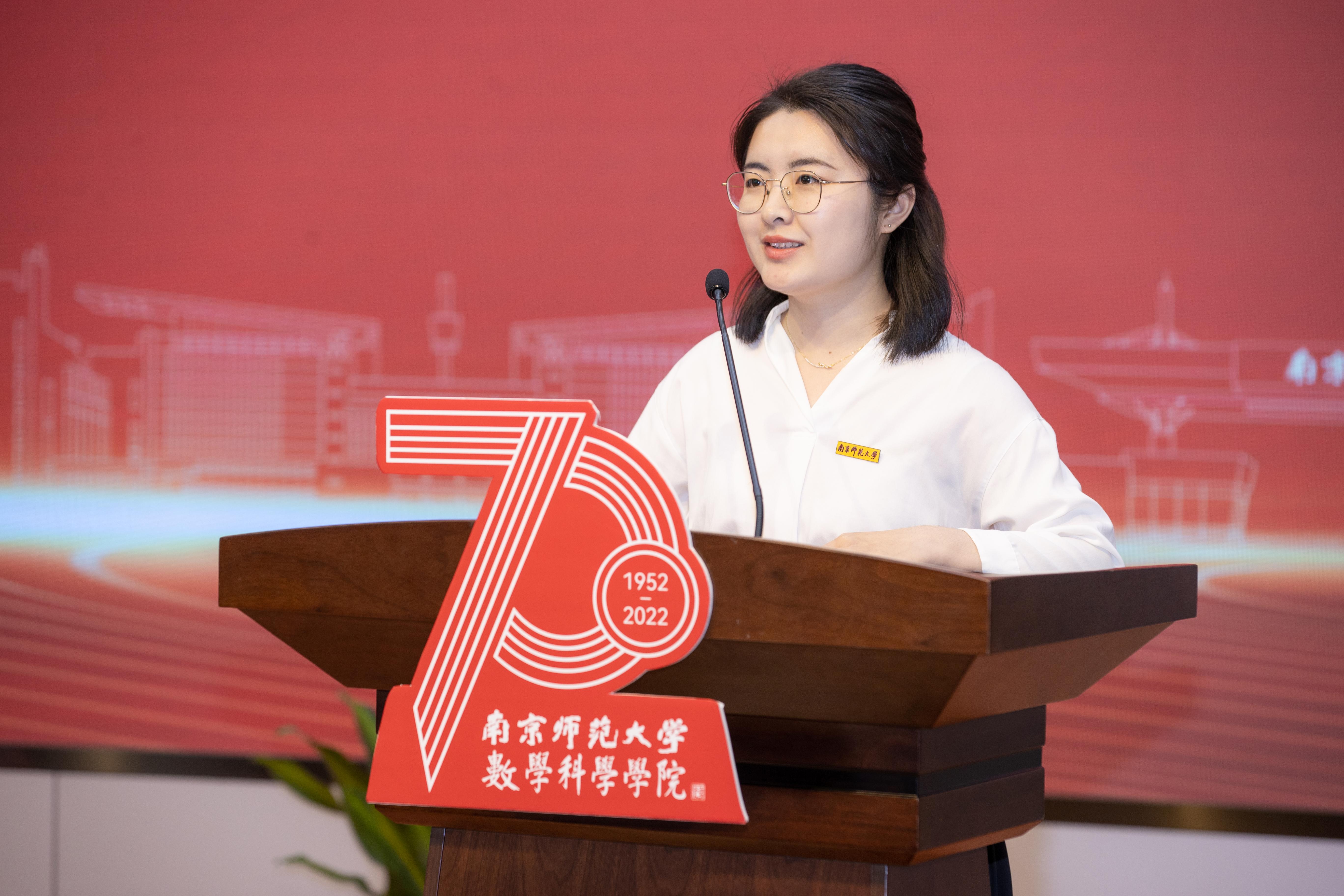 庆典大会上,正在香港中文大学交流访问的数科院教师孙海琳,以视频方式作为学院教师代表发言,他表示将大力弘扬“严谨务实,开拓创新”的院风,充分发挥数学学科优势,进一步提升人才培养质量,在科学研究上实现新的突破。学院学生代表、2020级硕士研究生陈有嘉在发言中表示,身为南师数院学子的她将传承师范血脉,赓续厚生基因,不负韶华,不负时代,以奋斗者的最美姿态迎接下一个数学学科璀璨70年。