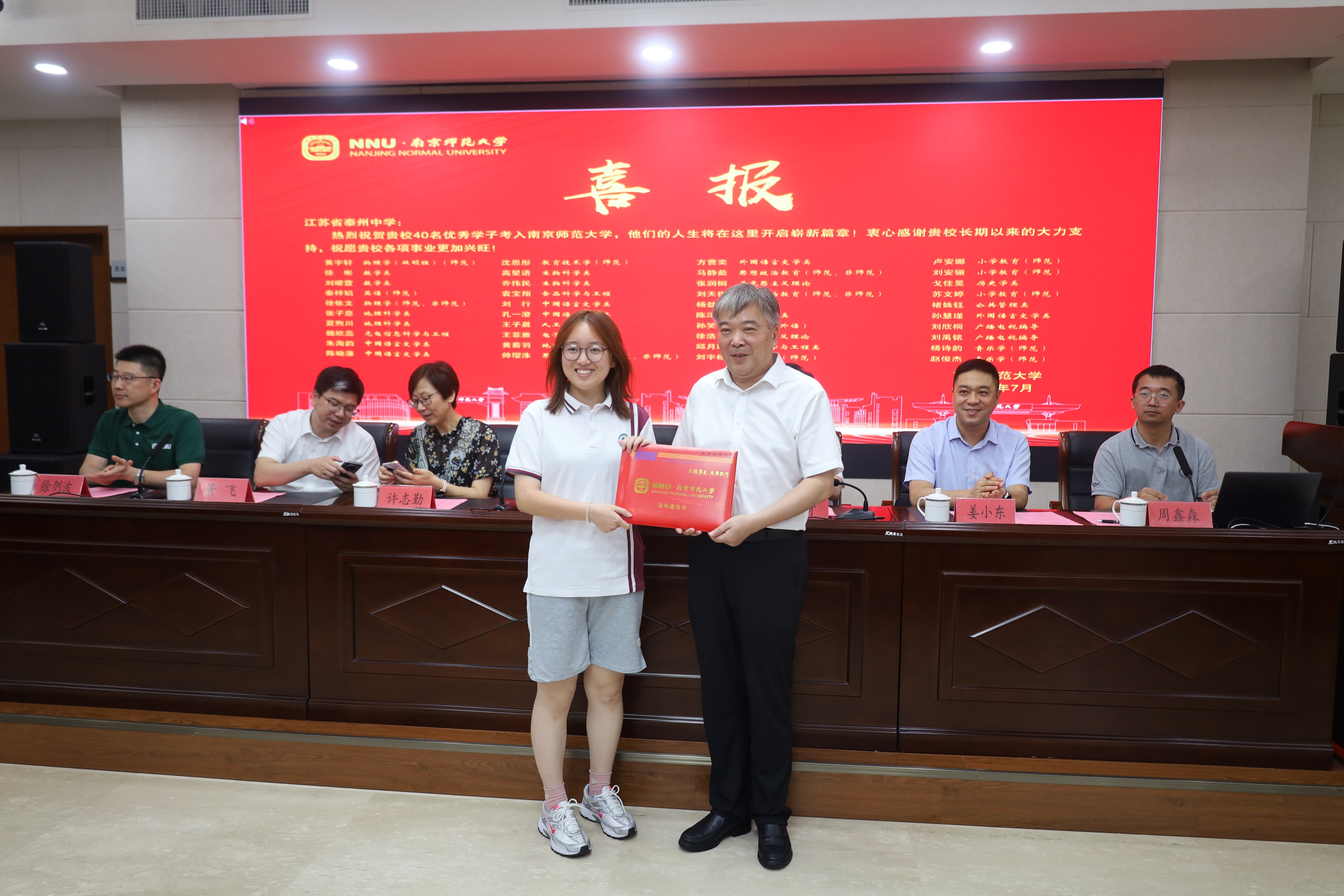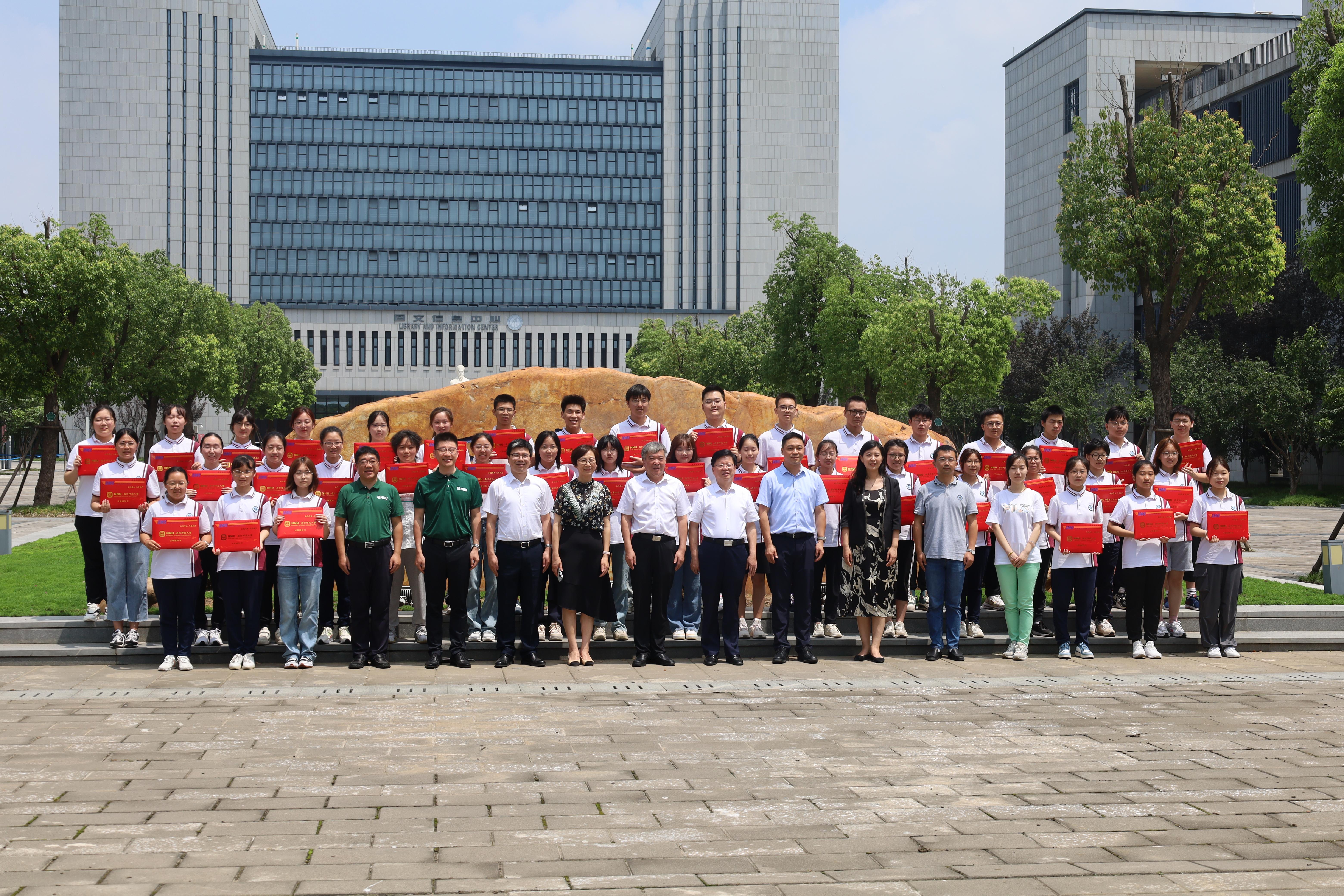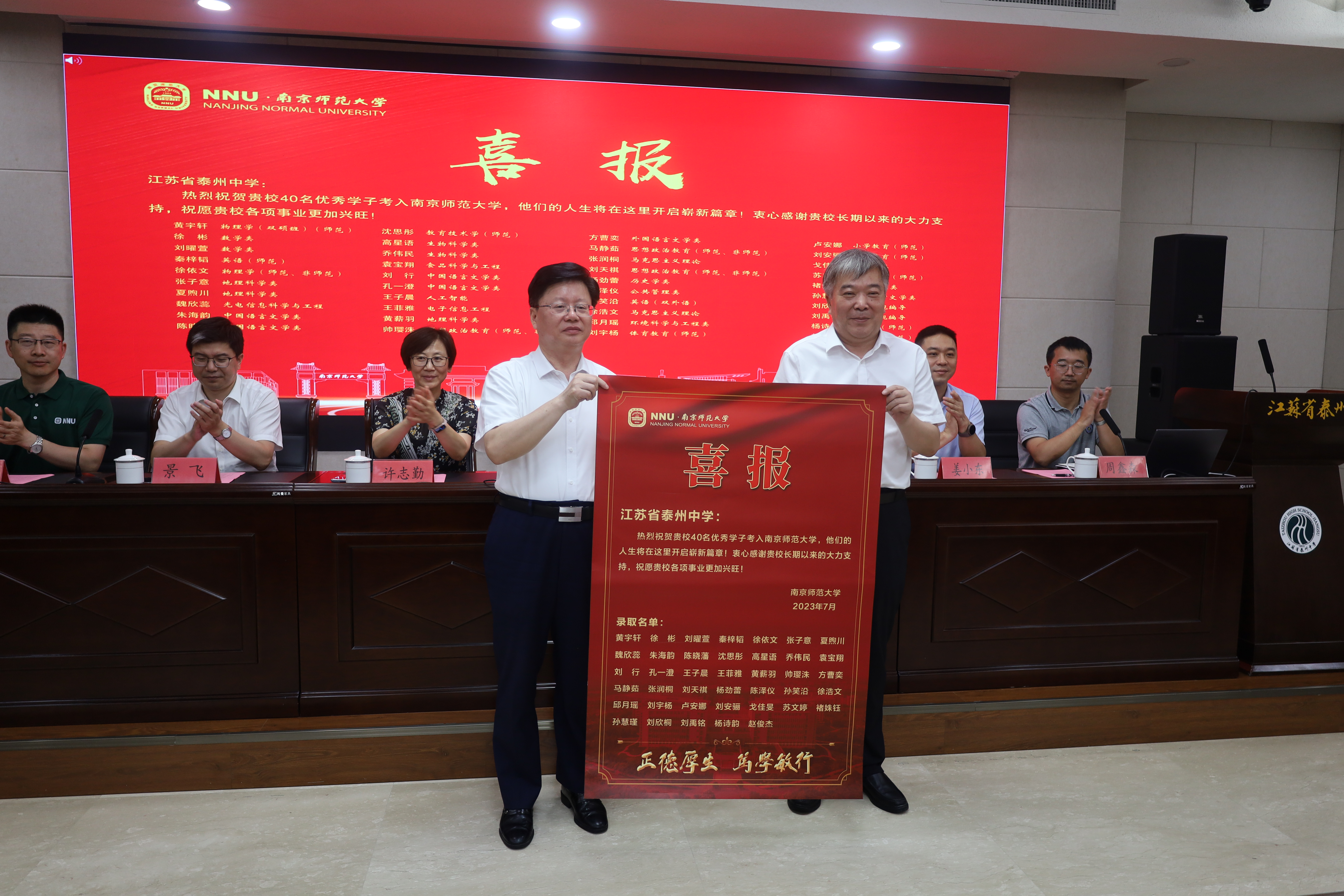南京师范大学校长办公室姜小东主任在颁发仪式上宣读了新生录取名单及录取专业,南京师范大学华桂宏校长向江苏省泰州中学封留才校长赠送了录取喜报。在热烈的气氛中,华桂宏校长逐一为40名2023级新生们颁发了录取通知书。南京师范大学学生工作处景飞处长向江苏省泰州中学许志勤副校长赠授了优质生源基地铜牌。新生代表、录取在数学类专业的刘曜萱同学在颁发仪式上做了发言,她由衷感谢泰州中学校领导、老师们的三年来的辛勤培育,并表示在今后的南师学习中坚持不懈,刻苦钻研,学出成就,报效祖国。