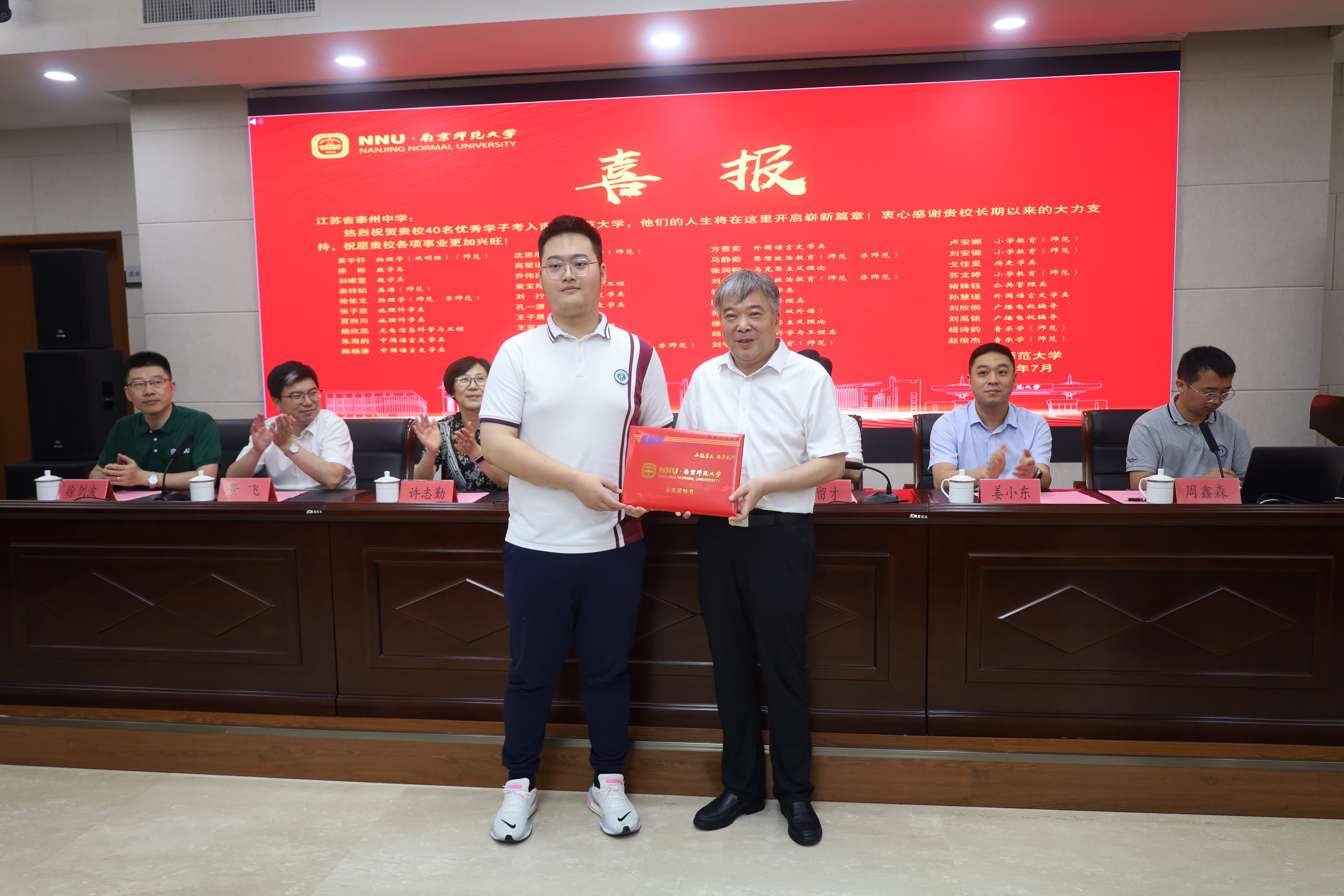 7月23日上午,南京师范大学校长华桂宏一行冒着酷暑专程前往江苏省泰州中学,为该校今年考取南京师范大学的40名2023级本科新生现场颁发录取通知书。南京师范大学校长办公室主任姜小东、学生工作处处长景飞、副处长韦希、网赌