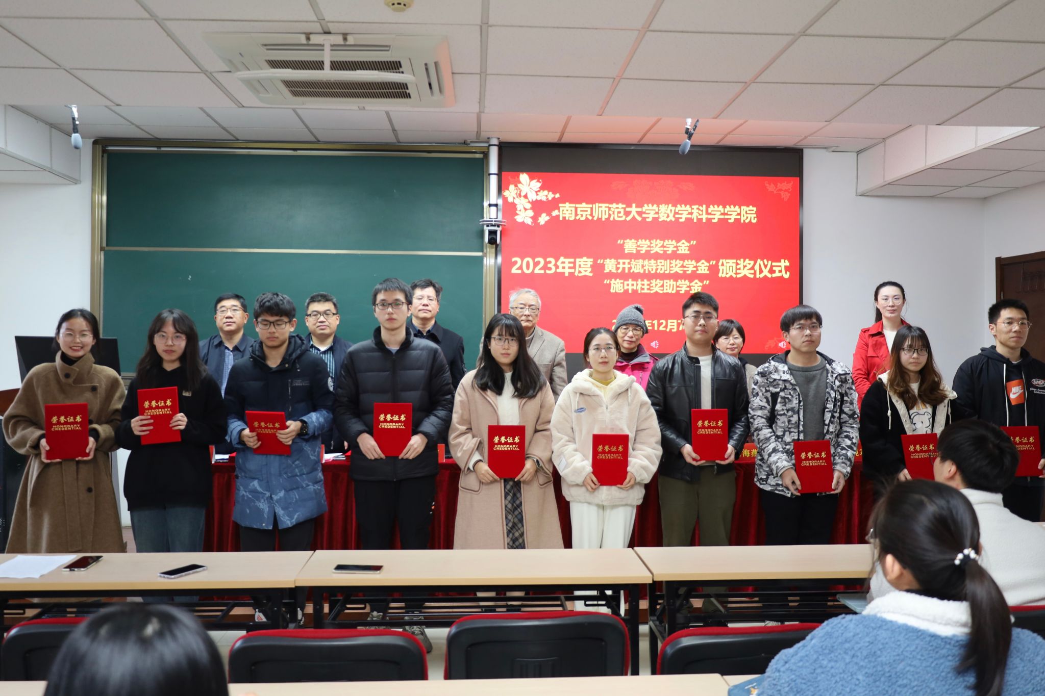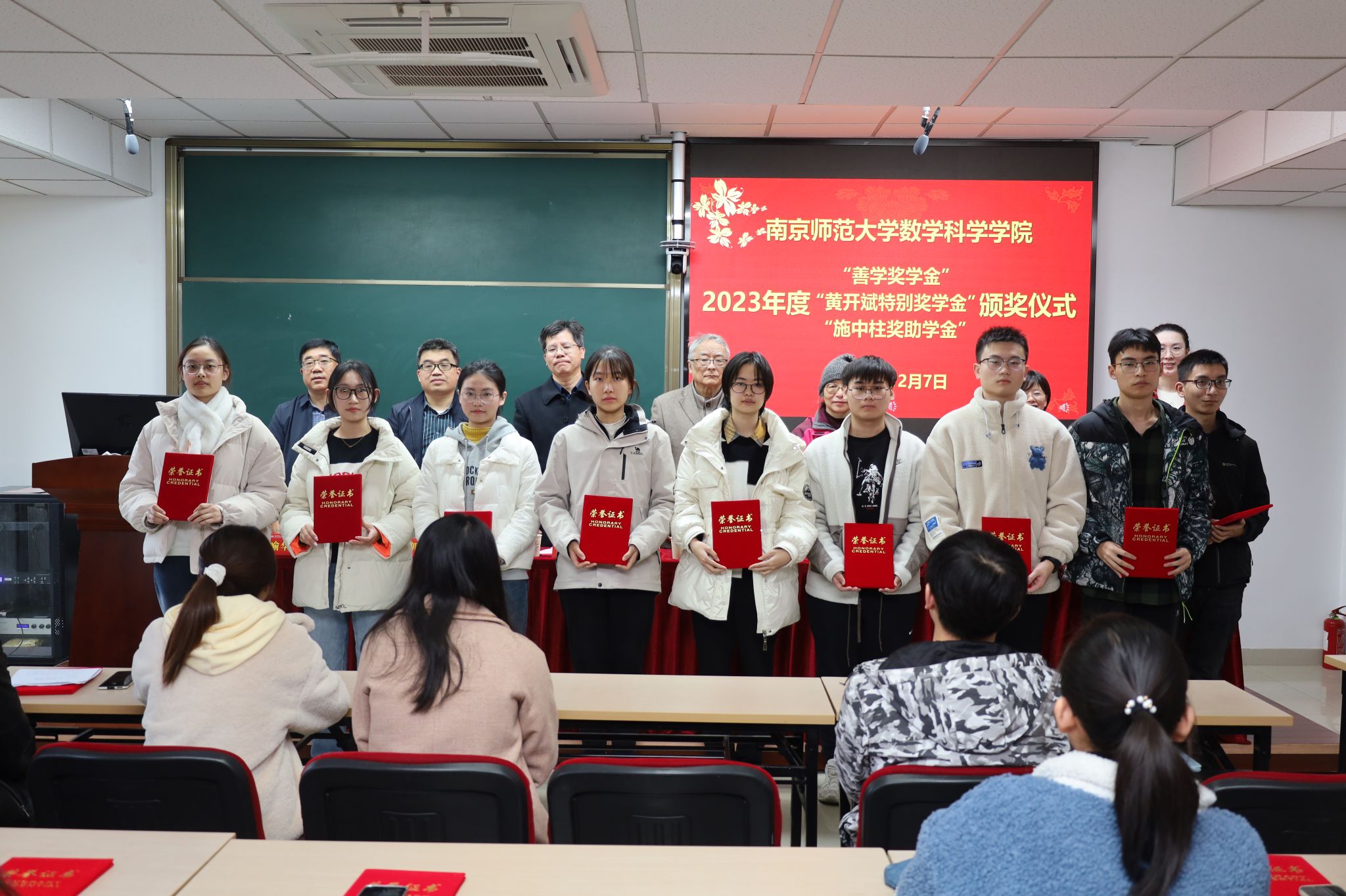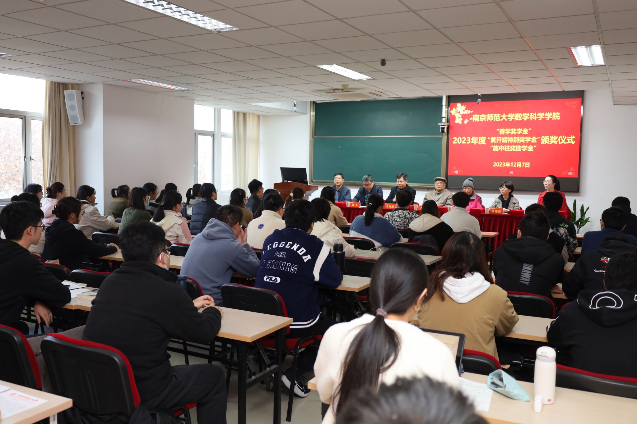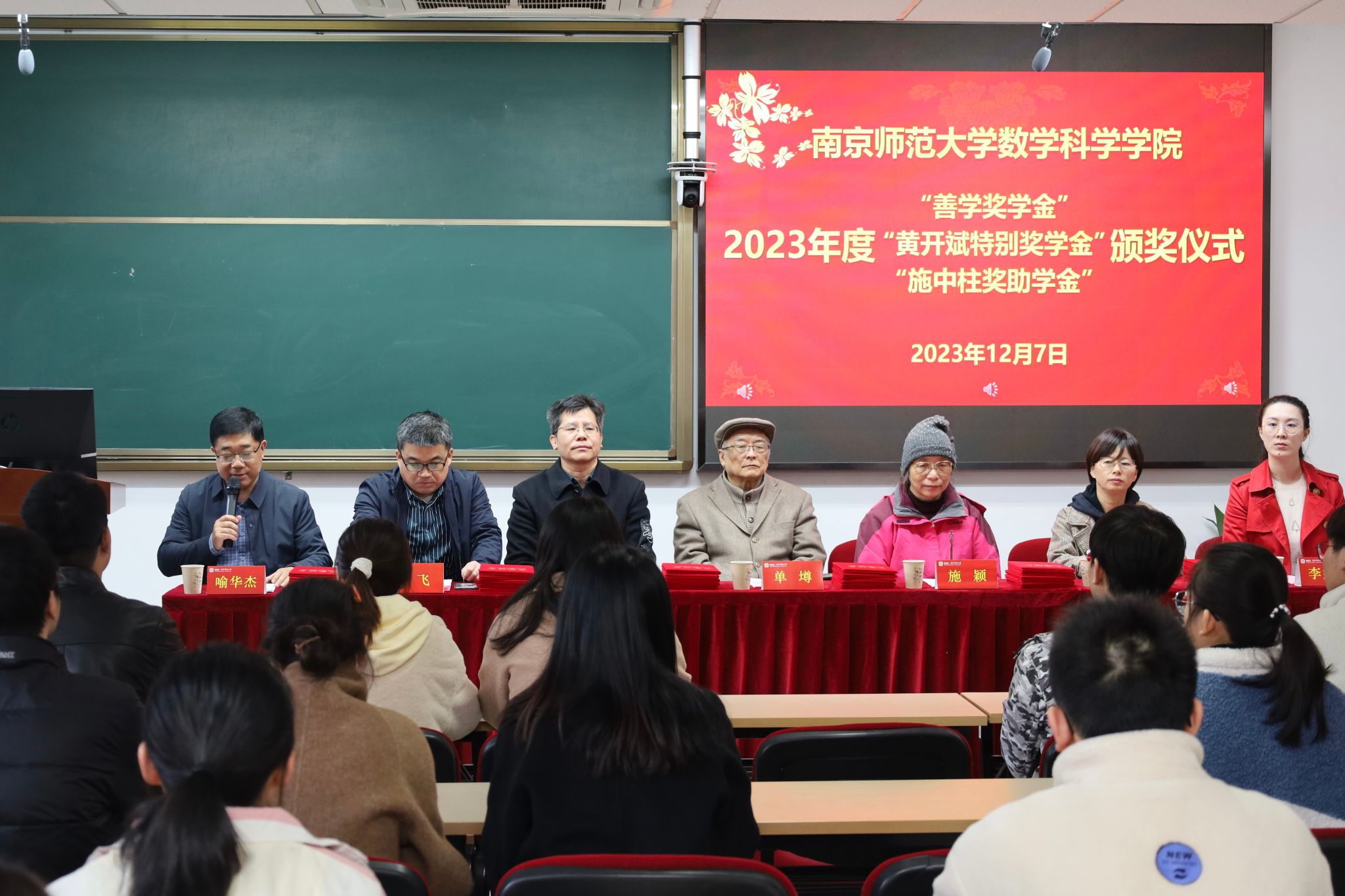 2023年度“善学奖学金”、“黄开斌特别奖学金”、“施中柱奖助学金”颁奖仪式在行健楼526室顺利举行。数科院原数学系主任、“善学奖学金”捐赠人单墫教授,“施中柱奖助学金”捐赠人、施中柱先生的女儿施颖女士,数科院党委书记王雨顺、副书记喻华杰,副院长郭飞、周海燕,院团委书记李婉君等老师出席了本次颁奖仪式,来自三项奖助学金获奖的本、硕、博四十余名同学共同参加了仪式,仪式由数科院党委副书记喻华杰主持。