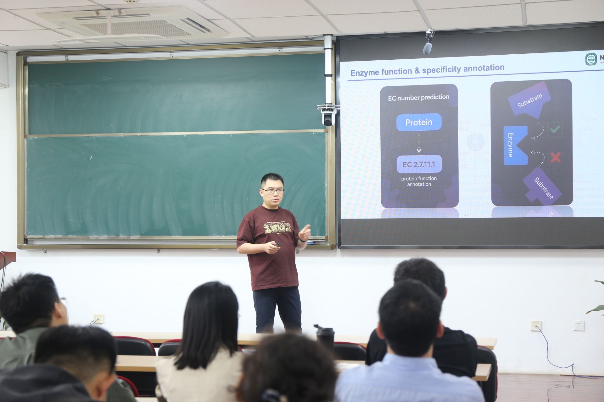 报告中,崔海洋教授聚焦酶功能注释与底物特异性预测这一酶学与合成生物学中的核心挑战,系统介绍其团队开发的两项互补的机器学习框架。首先,他提出CLEAN(对比学习驱动的酶功能注释工具),通过对比学习技术实现比传统BLASTp更精准、可靠的酶分类号(EC number)预测,并能纠正错误标注、识别多功能酶。其次,他展示了EZSpecificity模型——一种基于交叉注意力机制与SE(3)-等变图神经网络的底物特异性预测工具,该模型在序列和结构层次训练的酶-底物交互数据库上表现卓越,在卤化酶数据集上验证准确率达91.7%,显著优于现有主流方法。