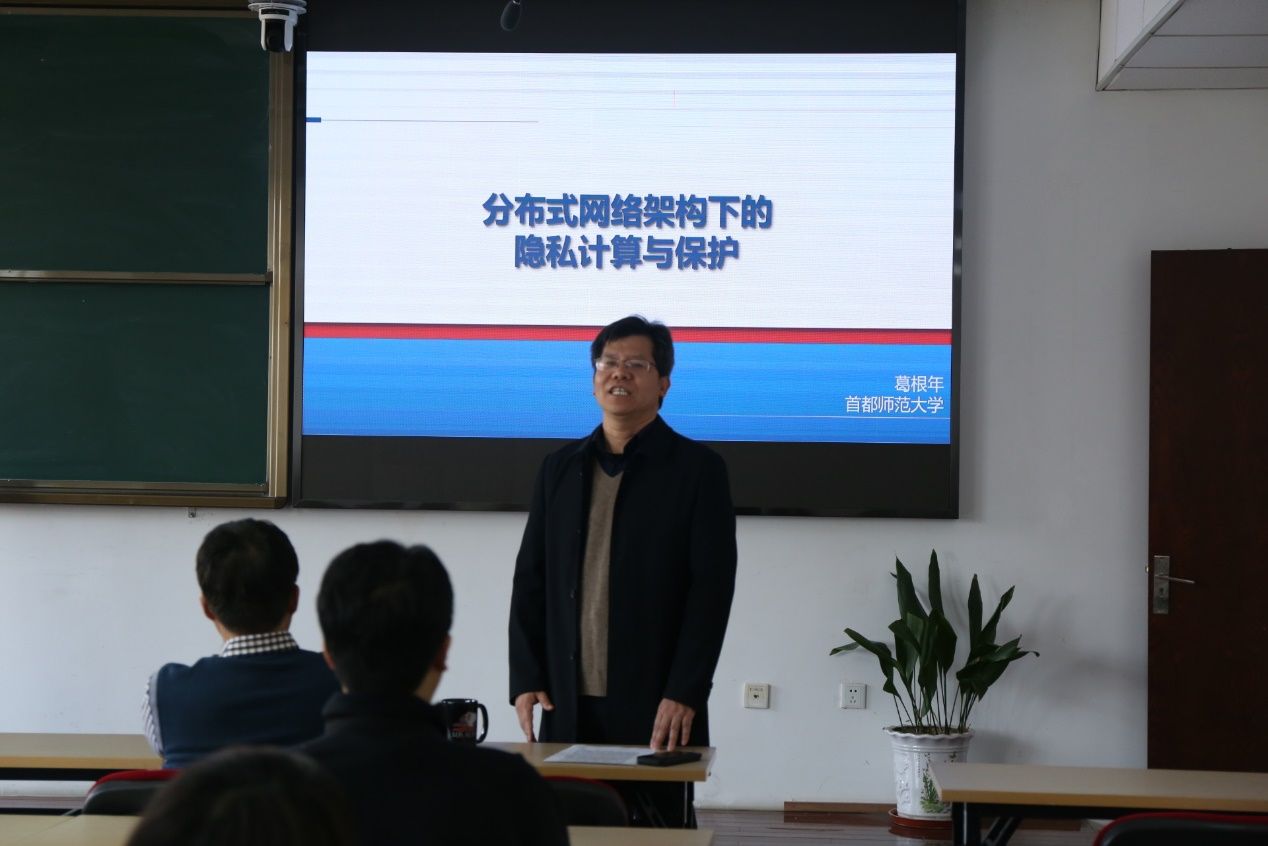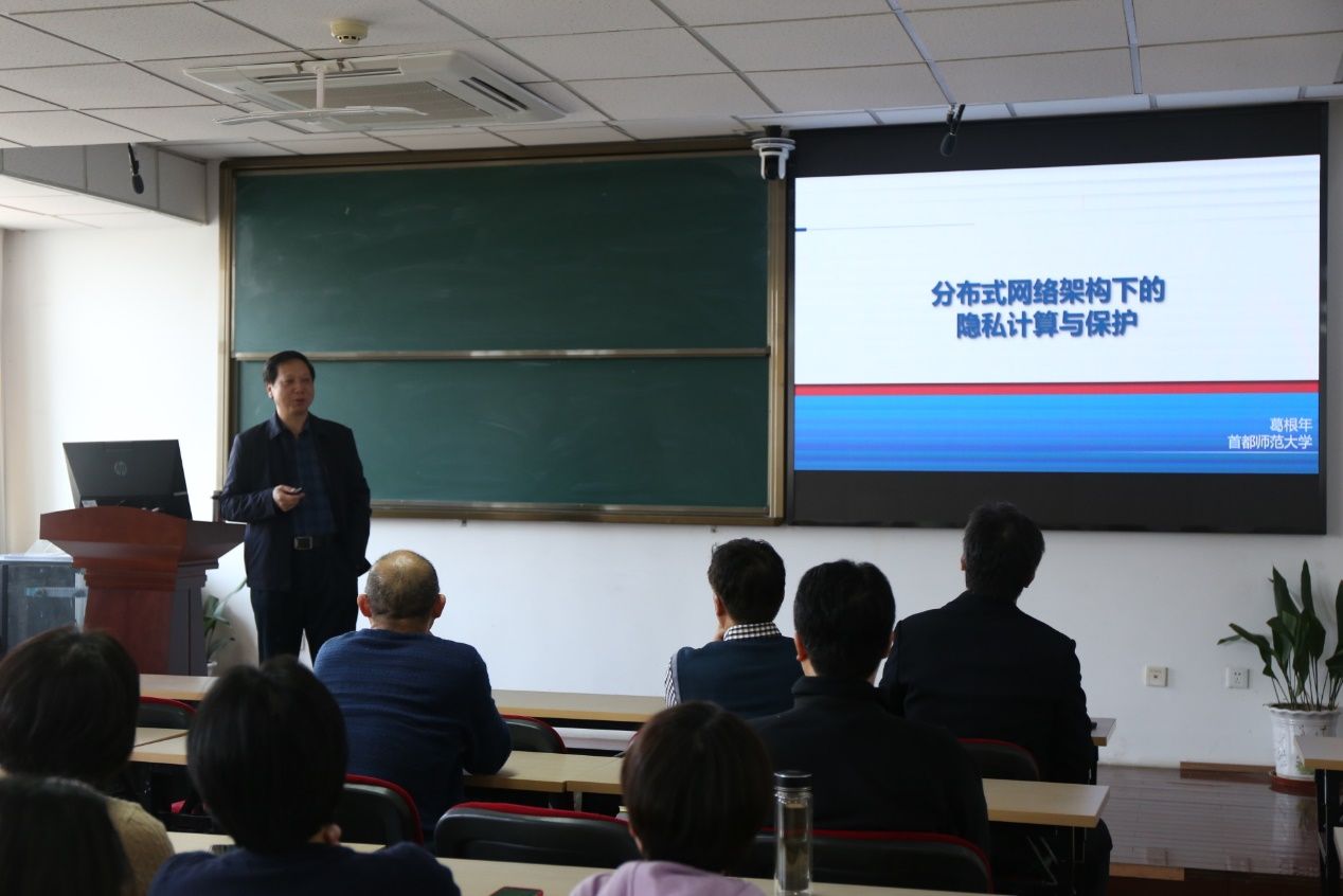 在本次报告会上,葛根年教授作了题为“分布式网络架构下的隐私计算与保护”的学术报告。葛教授介绍当前人类正在进入“人网物”三元融合的万物智能互联时代,网络通信与大数据、人工智能、云计算等技术深度融合。新一代信息技术的发展,必然会产生诸多新型信息科学问题,给经典信息论和编码理论带来新挑战。葛教授说在大数据与网络通信深度融合的背景下,海量数据分布在离散的终端,适用于分布式场景下满足全行业、巨容量、大连接、强算力、高可靠、高安全、低成本的新型网络理论与技术架构是学术界与产业界共同关注的重要研究方向,引领了近二十年来的信息科学多个前沿热点方向。报告中,葛教授对编码计算、网络函数计算、隐私保护信息检索及差分隐私问题的背景、模型及关键数学问题都做了简要介绍。