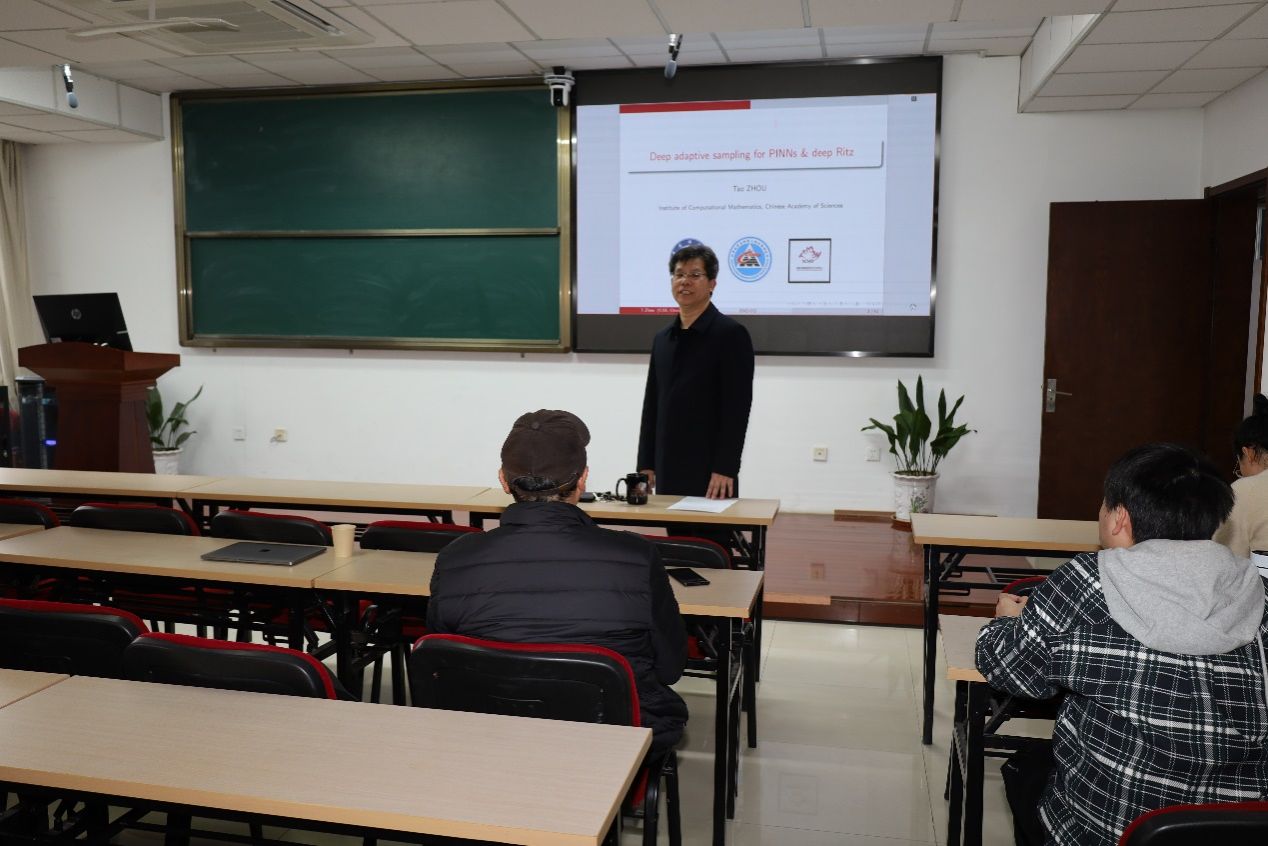 在本次报告会上,周涛研究员作了题为“Deep adaptive sampling for numerical PDEs”的学术报告。他类比有限元网格的两种构造思路:加密和移动网格,给出了用于解决偏微分方程的两种深度自适应采样方法:PINNS以及Deep Ritzs方法。报告同时给出了这两种新的自适应方法与传统的蒙特卡洛法的比较结果,由于引入了合理的采样方式,新的方法可以自适应地优化训练集,减少失败概率,大大提高了计算效率,在提高计算高维问题的计算效率上有很大的潜力。